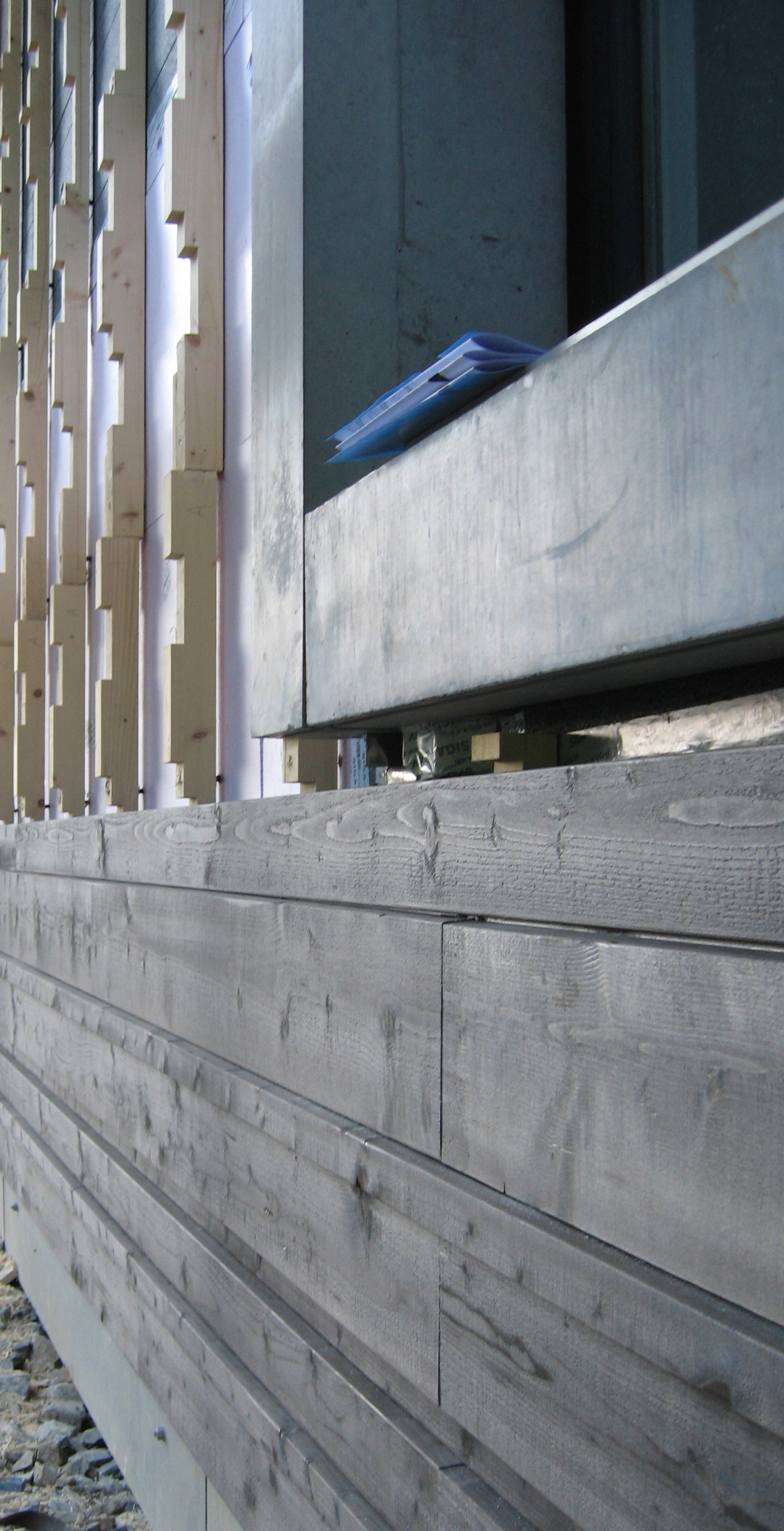 Die verschieden hohen Holzlatten, 5/10/15 und 20 cm, in unregelmässiger Reihenfolge waren die Grundlage für die Holzfassade. Die rohe und starke Umgebung mit Felsen, Wald und Hügeln, war Ausgangspunkt für die Weiterentwicklung der Fassade.