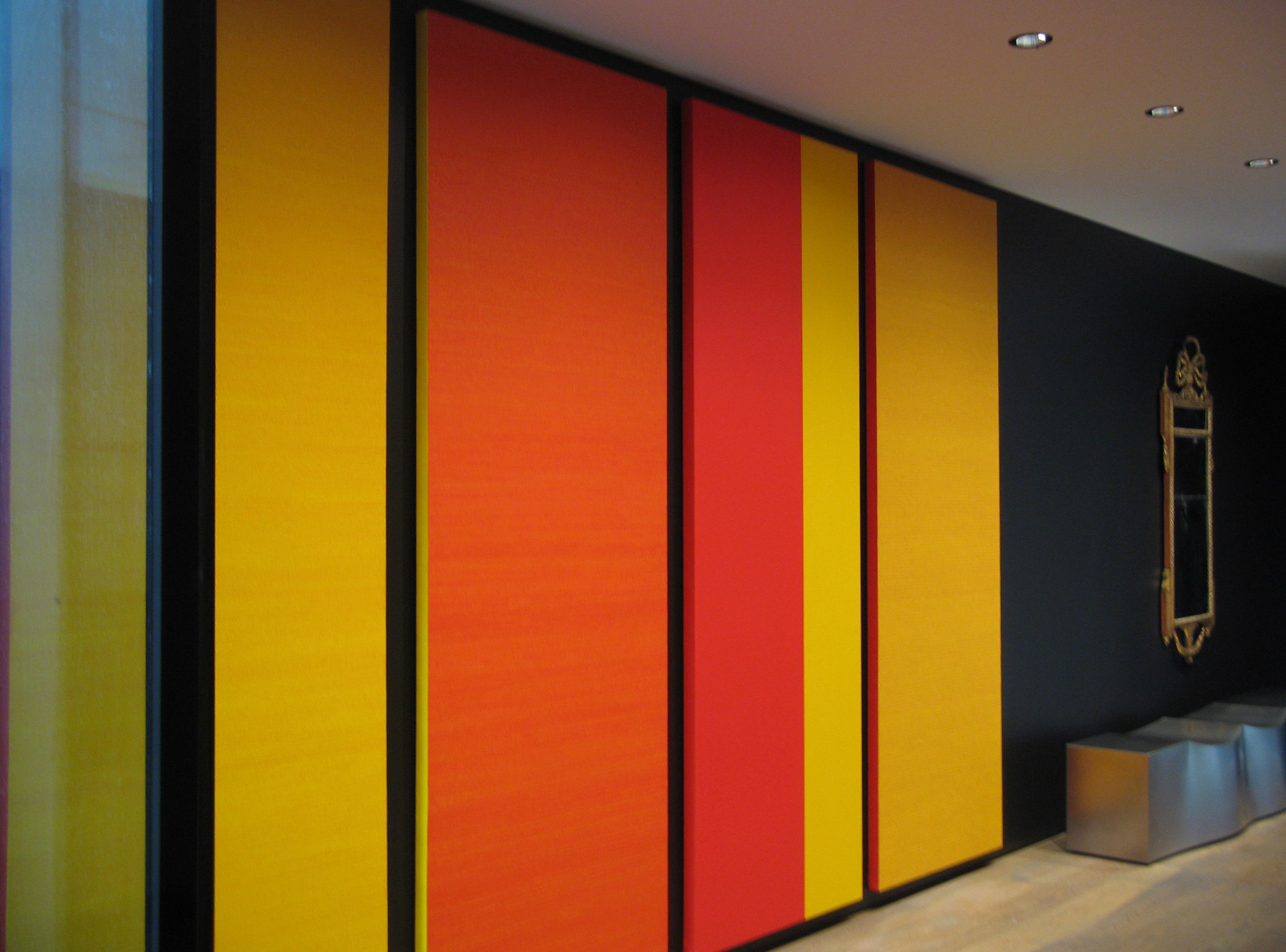 Die vier raumhohen Bilder in den beiden Farben Rot und Gelb, mit drei unterschiedlichen Oberflächenstrukturen (siehe unten) geben dem Entrée eine positive Energie ohne aufdringlich zu wirken. Die Antizipation ist immer etwas schwieriges. Welche Farbe soll die Wand haben; Gold, Rot oder Anthrazit? Wo soll der funktionale Teil wie Sitzbank und Spiegel platziert werden?