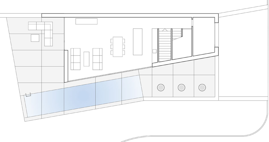 Bis auf zwei Elemente hat jedes der 43 Betonelemente, in Grau und SCC-Qualität, eine andere Geometrie. Alle Elemente sind in einem Abstand von 1 cm (Schattenfugen) zueinander und zur Hausfassade versetzt. Das Oberflächenwasser der beiden Sitzplätze wird über die offenen Schattenfugen abgeführt. Im Pool sind die Fugen zwischen den Betonelementen anthrazitfarbig ausgefugt und 1 cm tiefergesetzt, um so die Schattenfugenästhetik zu erhalten. Die Schattenfugen sind ein wichtiges architektonisches Element, ein Spiel von Flächen und Linien (Fugen), welche das Pool und die beiden Sitzplätze spannungsvoll gliedert.