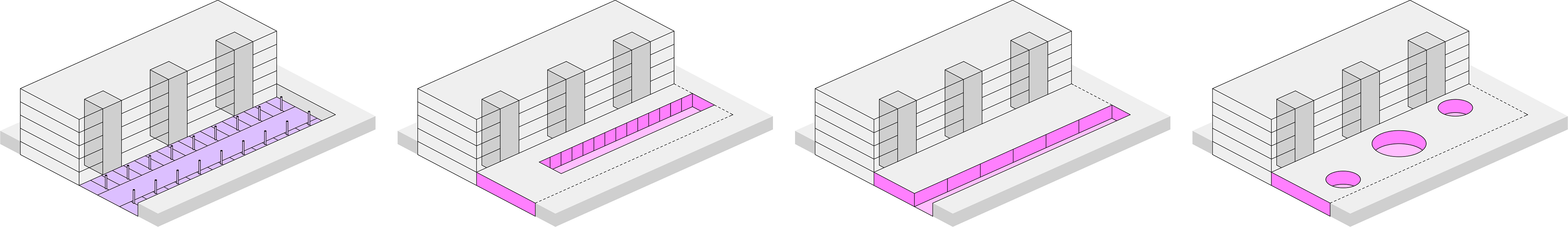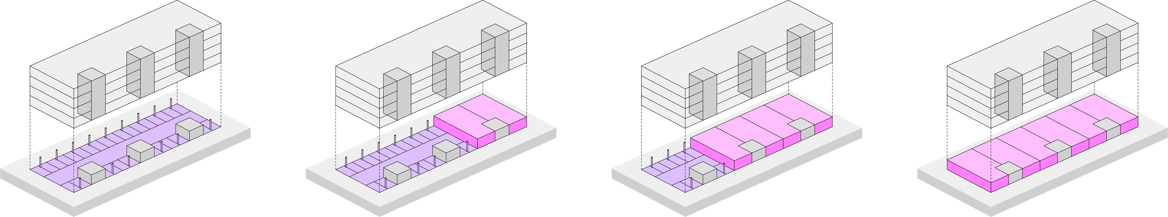 Wie planen und bauen wir heute Autoparkplätze, mit dem Wissen, dass wir ab dem Jahr 2030 immer weniger benötigen? Eine Möglichkeit ist das Haus auf Stützen, wie es Le Corbusier schon 1947 mit der «Unité d’Habitation» in Marseille vorgemacht hat. Mit Mehrfamilienhäusern auf Stützen (siehe Skizze unten) haben wir die Möglichkeit, die heute benötigte Parkplatz-Infrastruktur direkt unter dem Wohnhaus, im Parterre, zur Verfügung zu haben. Später, wenn die Nachfrage nach Parkplätzen zurück geht, können die freiwerdenden Flächen etappenweise mit Wohnungen ergänzt werden.