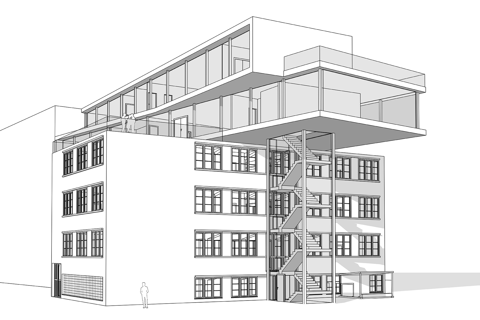 Im Bereich der Planung wurden uns Normen, verschiedene Baumaterialien und das Entwickeln von Details gezeigt. Für mich als Studentin ohne Hochbauzeichnerlehre ist dies eines der wichtigeren Fächer. Darauf basierend folgte eine Gruppenarbeit, bei der die Aufgabe darin bestand, eine Nutzungsstudie für das Gewerbegebäude von Carl Mossdorf an der Tribschenstrasse 51 in Luzern zu entwickeln. Der vom Abbruch bedrohte Bau ist sehr umstritten und für uns Luzerner ein aktuelles Thema, zu dem viele einen persönlichen Bezug haben. Mit Vorgaben zum Planungsperimeter, der Anzahl Geschosse und Funktionen mussten wir eine möglichst ökonomische Lösung präsentieren, wobei der Entwurf nicht an erster Stelle stand. Den Vorteil, den wir als Studenten geniessen ist, dass die Dozenten ein gut begründetes Missachten der Normen oder Bauvorschriften akzeptieren. Auf der Strichperspektive ist unser unkonventionelles Endresultat sichtbar; ein zweigeschossiger Riegel quer über dem Gewerbegebäude.