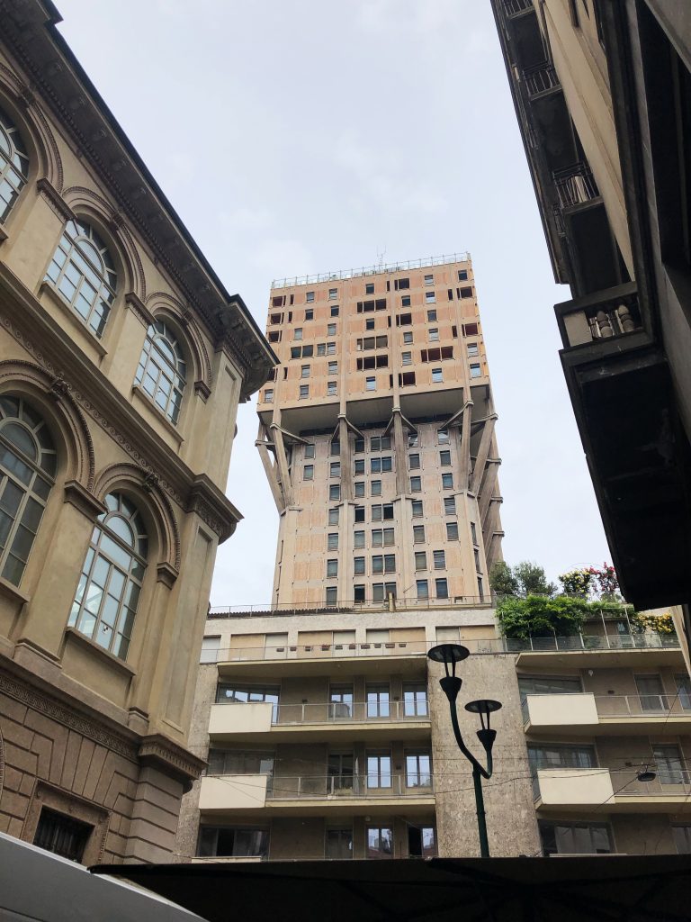 Der «Torre Velasca» charakterisiert die Italo-Moderne ausgezeichnet. Er hebt sich mit seiner Höhe von 106 Metern von der Umgebung ab und prägt somit das Stadtbild. Das Faszinierende ist seine untypische Form. Anstelle einer Verjüngung in die Höhe, geschieht bei diesem Gebäude das Gegenteil; die oberen Geschosse ragen pilzförmig an den Betonstreben aus. Dadurch erhält der Turm eine fragile Wirkung und gibt dem Betrachter das Gefühl, die auskragende Kante könnte abbrechen. Mit vier vertikalen Pfeilern wird die Querfassade dreigeteilt (sechs vertikale Pfeiler teilen die Längsfassade). Weiter wird die Fassade durch spangenförmige, fensterhohe Lisenen in der Vertikalen durchgängig gegliedert. Zwischen die Lisenen spannt sich eine unregelmässige, Tetris-artige Struktur, welche aus Fenstern, Balkonen und schmalen Betonelementen besteht. Die horizontalen, geschlossenen Brüstungsbänder stehen in einem Kontrast zu den vertikalen Fassadenelementen. Trotz des italienischen «Dolce Vita» schien mir die Fassadengestaltung bei den meisten modernen Gebäuden sehr strukturiert. Themen, wie beispielsweise die Gewände um die Fenster, werden wiederholend aufgegriffen.