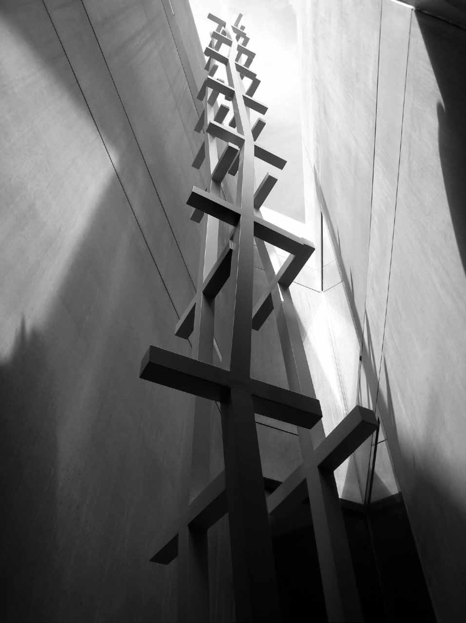 Der zweite künstlerische Eingriff verlagert sich von der Horizontalen (Entrée) in die Vertikale ins Atrium oder Vitrine, wie Annalisa diesen Raum beschreibt. Eine weisse Metallskulptur aus aneinandergereihten T-Profilen verbindet die drei Geschosse des Hauses über acht Meter miteinander. Beide Arbeiten zeichnen sich durch einfache Grundformen und der Wiederholung aus.
