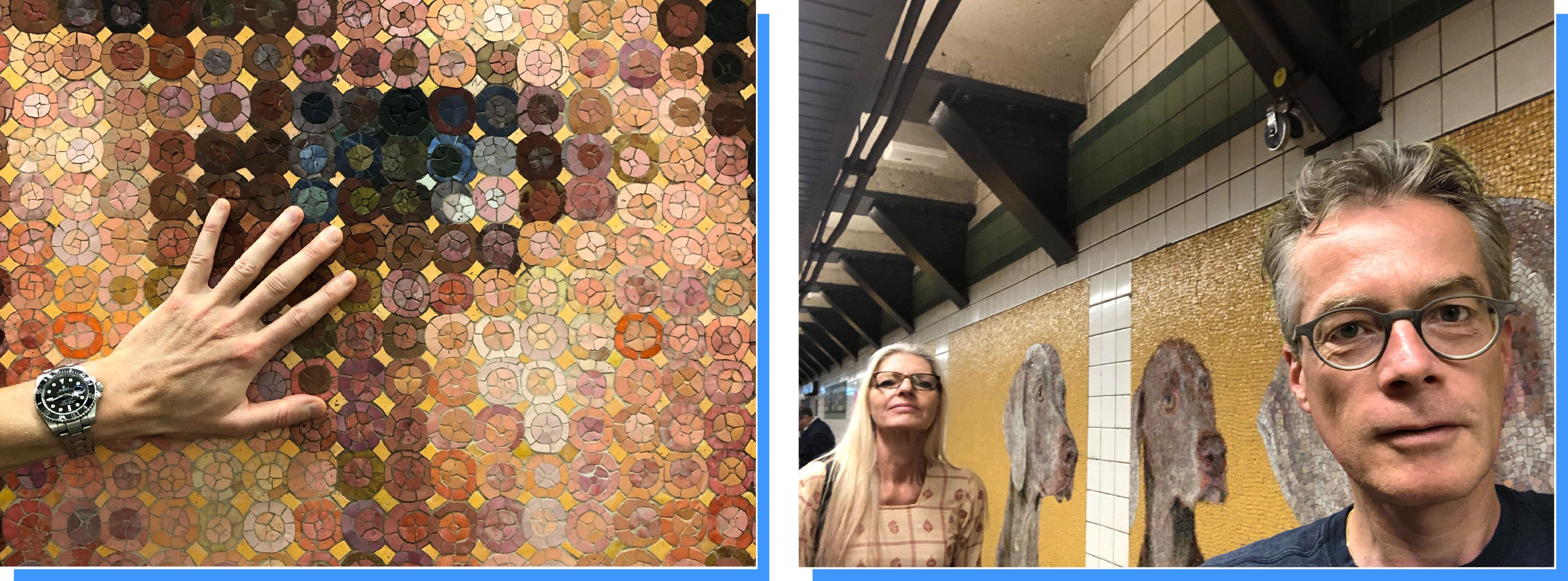 Die Vorbereitung der Tour war schon ein kleiner Marathon, siehe auch Post «NYC Subway Contemporary Art & Design Trip: Idee und Vorbereitung – Teil I / II». Um alle 31 Stationen zu besuchen, haben Renate Stürmer und ich uns zwischen dem 14. und 26. September 2019 fünf mal Nachmittags auf eine super interessante «Kunst am Bau»- Reise begeben. Jede Station hat eine andere Atmosphäre bezüglich Menschen, Architektur und Kunst. Mit der Programm-Zusammenstellung kam die Idee auf, alle Station zu dokumentieren. Was für unseren Trip hiess: Fotos & Videos machen, Kunstobjekte zählen und die Auffindbarkeit von Kunstobjekten, wo nötig, beschreiben. Aktuell gibt es, meines Wissens, keinen NYC Subway Contemporary Art & Design Guide, welcher einem einen Vorgeschmack auf das gibt, was einen auf so einer Reise erwartet. Um dem ganzen Subway-Art-Trip eine persönliche Note zu geben, haben wir bei jeder Station ein Art & Design Selfie geschossen, so wie ich das seit dem Büroausflug nach Kopenhagen im Jahr 2017 – Architektur-Selfie – immer mache.