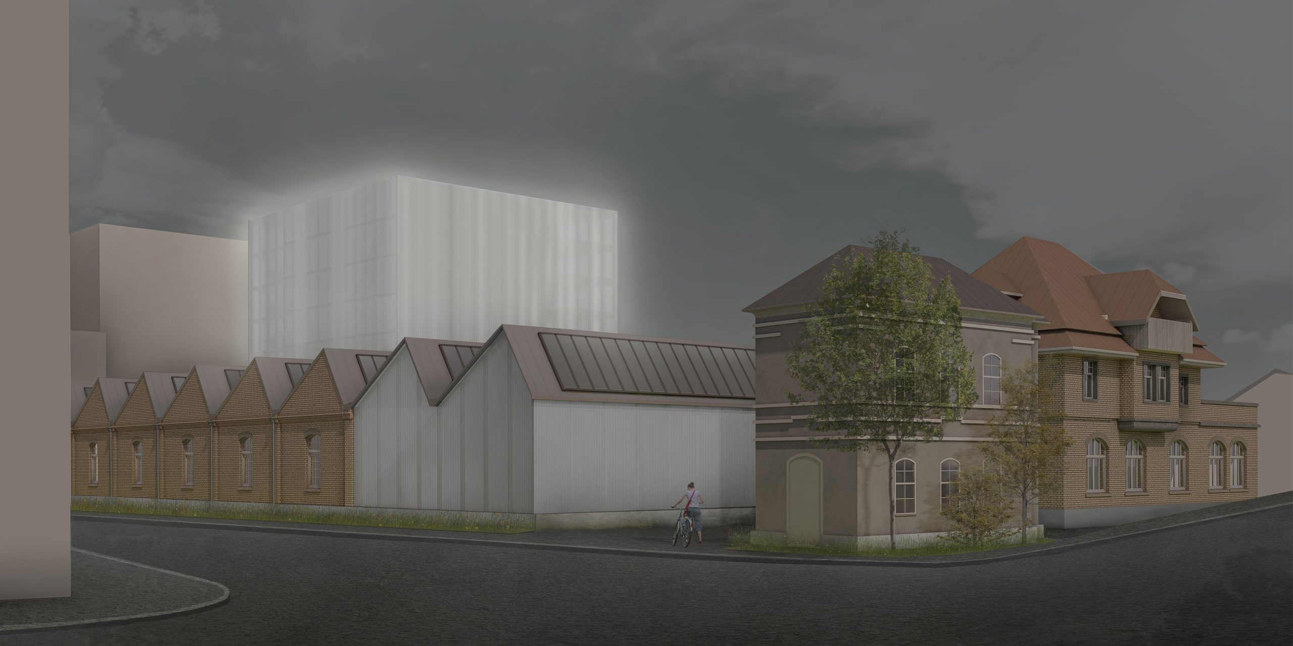 Mein Konzept beruht auf der Idee, dass zur historischen Bausubstanz der denkmalgeschützten Halle mit einem modernen sechsgeschossigen Erweiterungsbau ein sichtbarer Kontrast gesetzt wird. Der Erweiterungsbau ist ein kubisch transluzider Monolith, der die Idee einer Laterne aufgreift. Am Tag ist das Gebäude weiss und zurückhaltend, in der Nacht wird es zum leuchtenden Wegweiser. Zudem wird die Halle um zwei Achsen bis an den Verwaltungsbau mit Walmdach und Lukarnen erweitert. (Um detaillierter in das Projekt einzutauchen, siehe Semesterabgabe 31 MB).