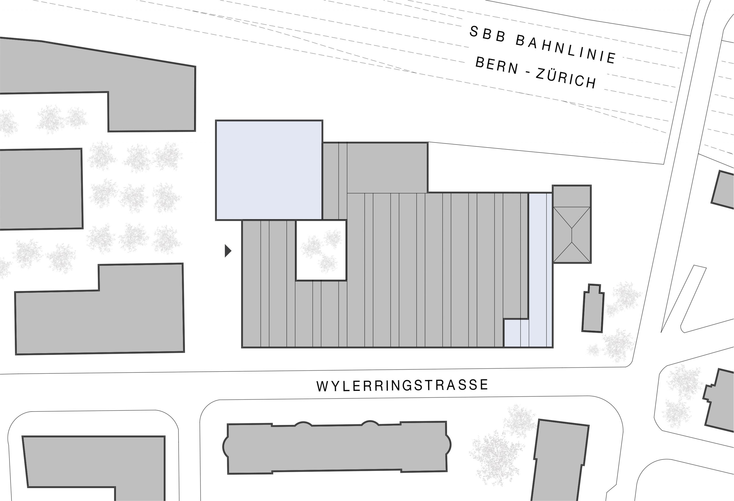 Die Theaterschule ist zum Wohnquartier hin adressiert. Der Eingang befindet sich im Übergang von Bestand und Neubau. Der Auftakt zu den Wohnbauten, welcher als öffentlicher Platz gestaltet und von der Wylerringstrasse abgeschottet ist, wird dadurch aktiviert und mit der Quartierstrasse verbunden. Im Eingangsbereich werden die zentralen Räume für den Publikumsverkehr angeordnet. Durch einen begrünten Innenhof wird der Publikumsverkehr von den Projekträumen der Studierenden getrennt. Die Verglasung ermöglicht jedoch den Durchblick durch das Gebäude. Der Verwaltungsbau wird durch eine Erweiterung ganzheitlich mit der Halle verbunden und wird auch zukünftig für Büroräumlichkeiten genutzt.