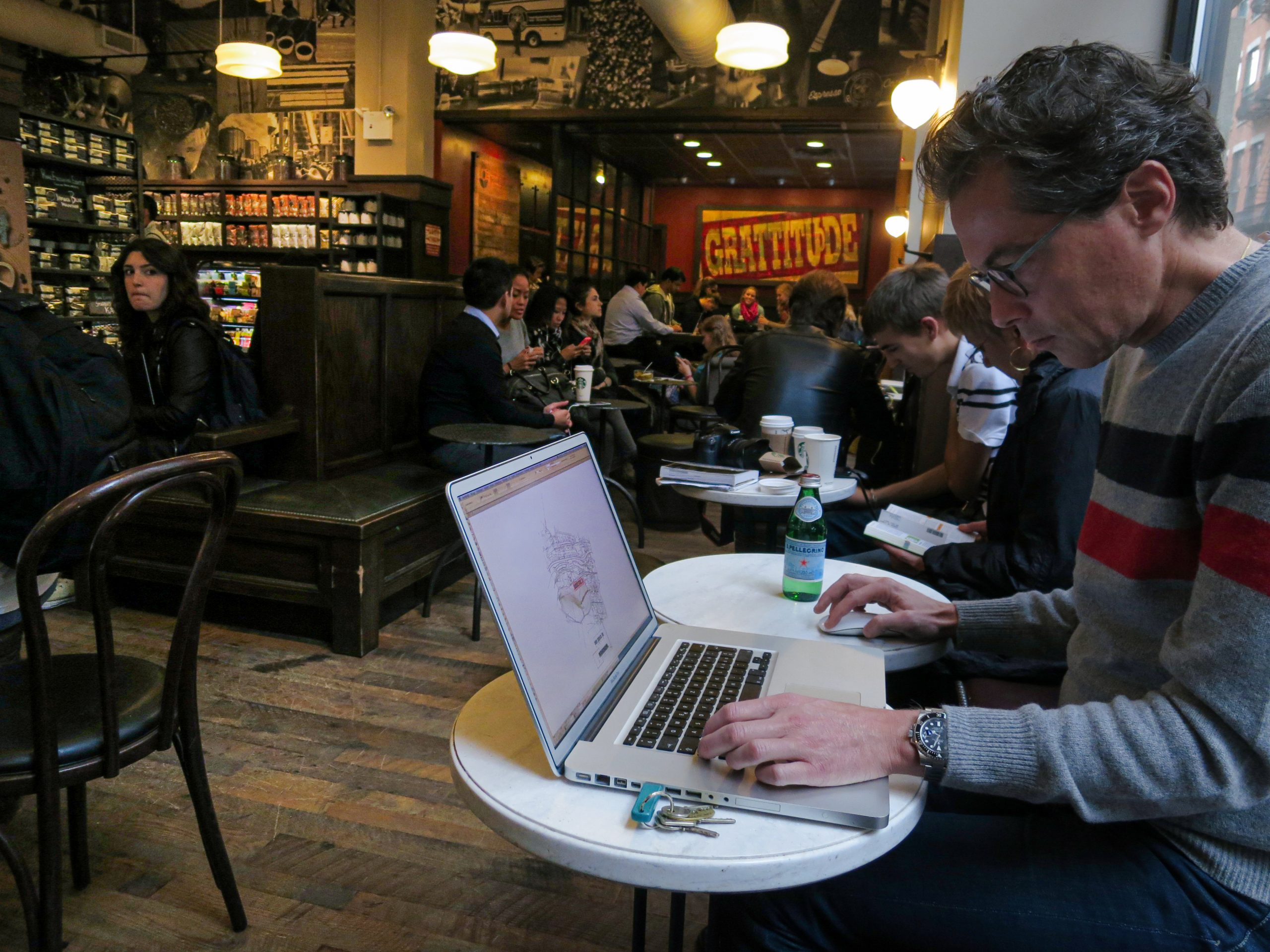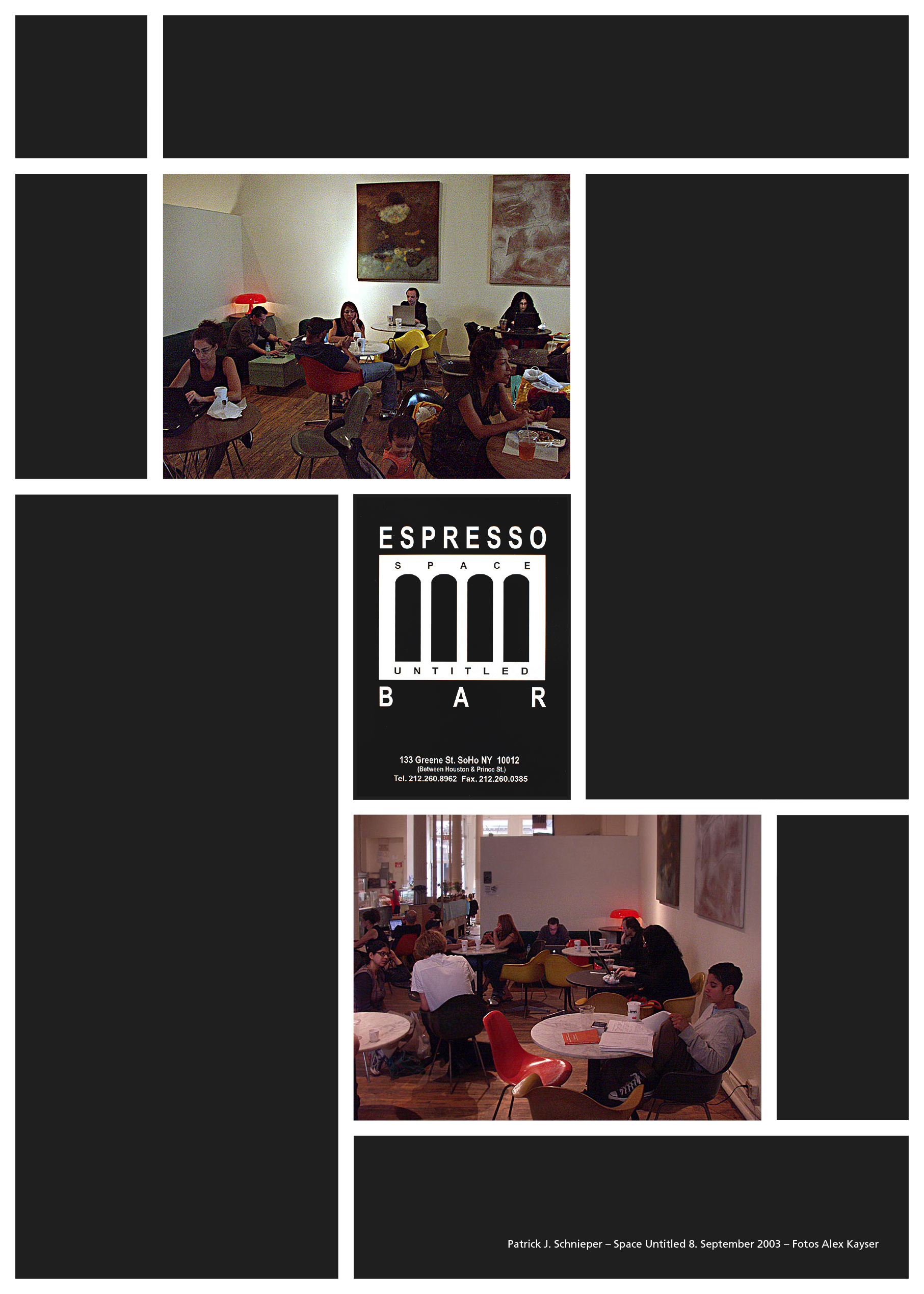 In den ersten paar Jahren verbrachte ich meine Arbeitsnachmittage in der Espresso Bar «Space Untitled» in der Greene Street im SoHo. Ein «Place to Be», wo man sich zum Kaffee getroffen hatte. Das Arbeiten mit einem CAD-Programm in einem Kaffee auf einem Mac-PowerBook-Titanium war anfangs der Nullerjahre selbst für New Yorker etwas besonderes. Nach der Schliessung der Espresso Bar im Jahre 2008, arbeitete ich in der Aroma Espresso Bar an der 145 Greene Street (neu an der 100 Church Street) und im Gotan in direkter Nachbarschaft zum Loft von Alex. Ab dem Jahr 2011 zügelte ich mein «SoHo Coffee Office» in den *Starbucks at Spring & Crosby Street. Der Starbucks liegt in direkter Nachbarschaft zum MoMA Design Store und zum Restaurant Balthazar und ist nur ein Steinwurf von Little Italy entfernt. Für mich neben dem Astor Place Starbucks einer der interessantesten Starbucks bezüglich Publikum in Manhattan.