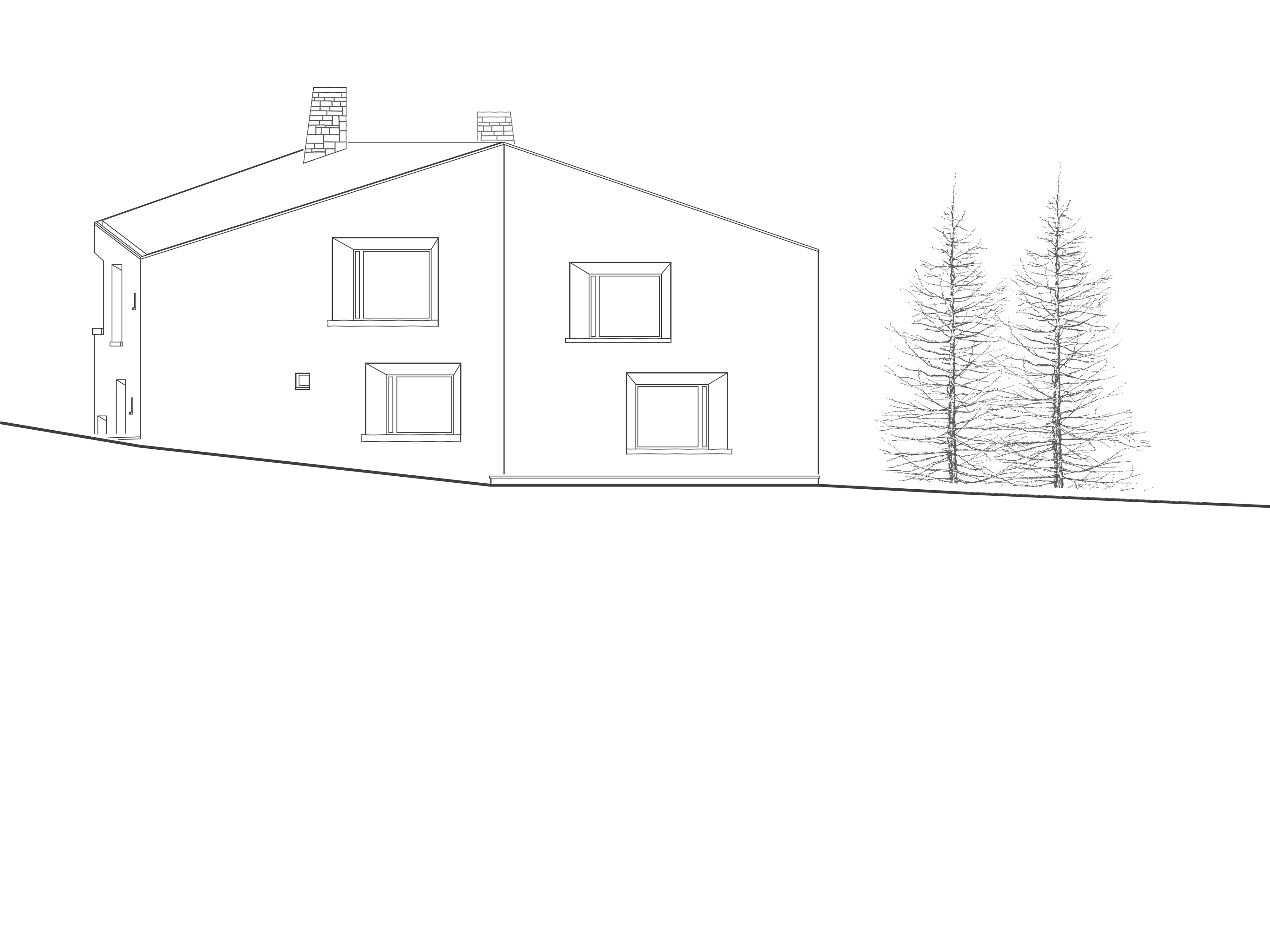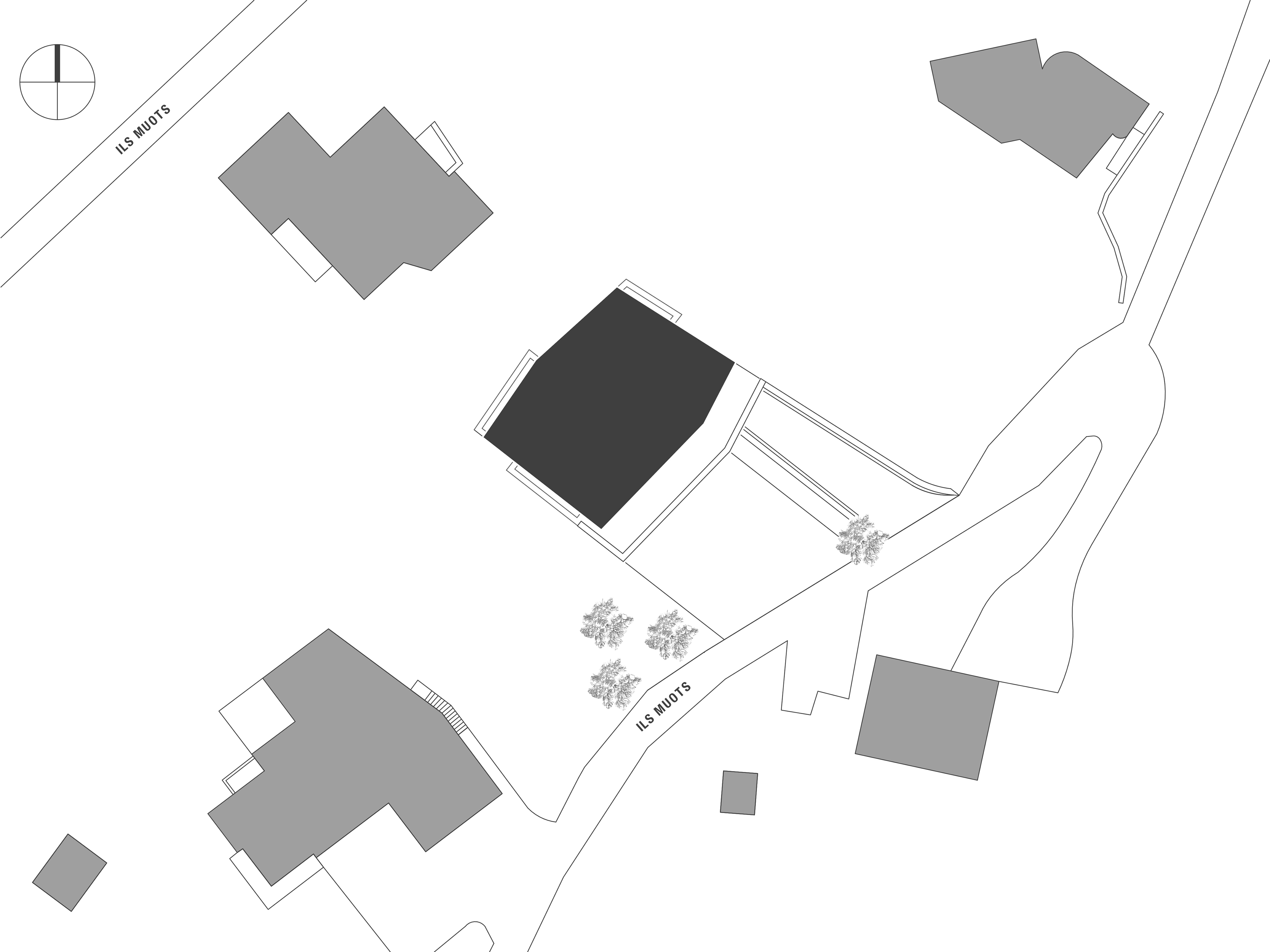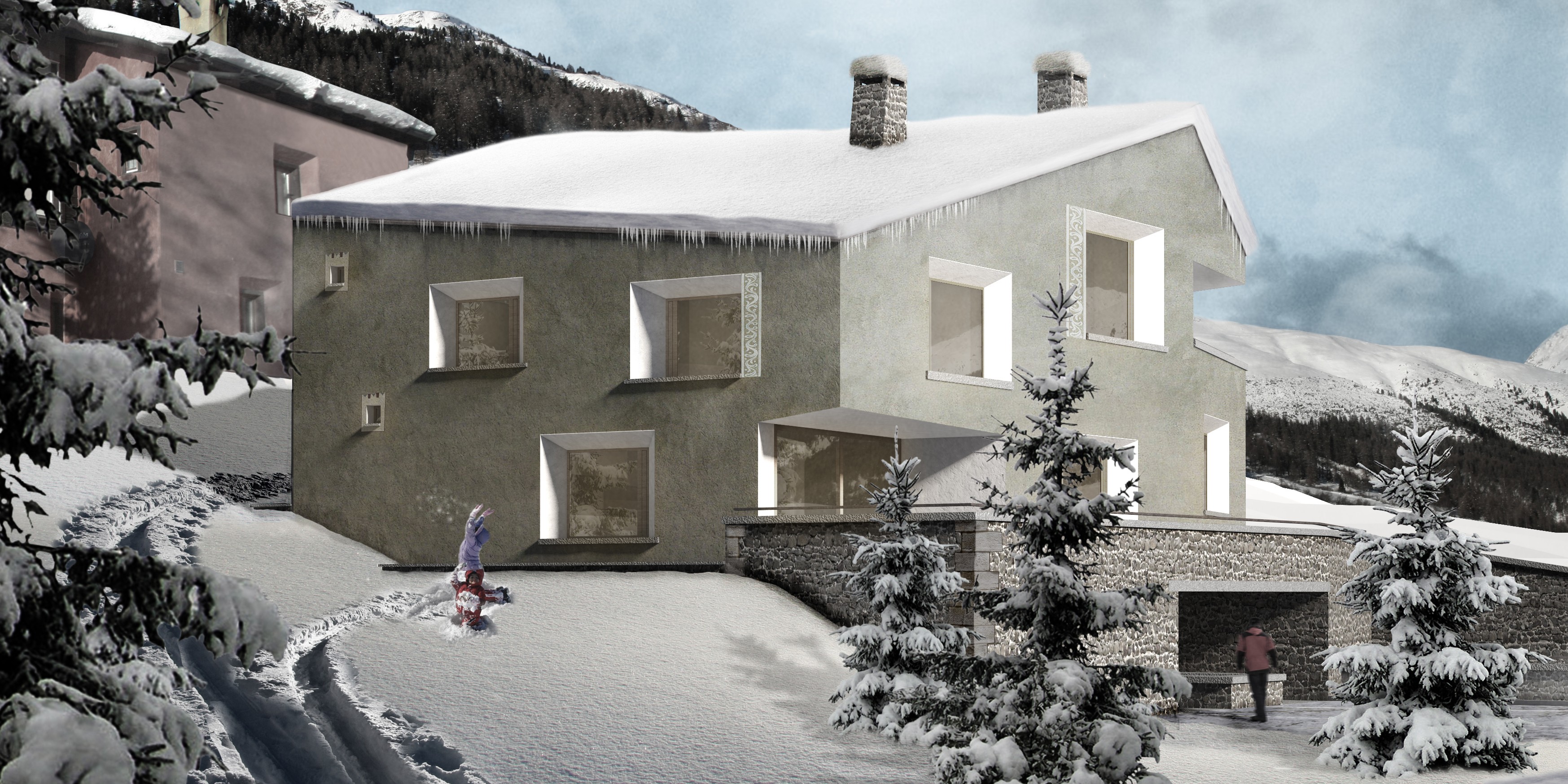 Das Gebäude ist im nördlichen Teil des Grundstücks auf dem alten Bauplatz des ehemaligen «Haus Wieser» platziert, so dass der resultierende Freiraum als vorgelagerter Vorplatz mit Zufahrt, Stellplätzen und Einstellhallenrampe genutzt werden kann. Die entstehenden Funktionsflächen des Aussenraums sind zurückhaltend über die Materialisierung differenziert. Asphaltierte Fahr- und Gehwege, mit Kies belegte Stellflächen und bepflanzte Grünbereiche integrieren sich harmonisch in die bestehende Umgebung. Die Besonderheit des Grundstücks, eine kreuzende Wasserader, wird zum spürbaren Gestaltungselement des Platzes und ist über die Fassung in einem Brunnen mit Rinnenablauf für die Bewohner des Hauses nutzbar gemacht. Der Wasserverlauf über den Vorplatz führt sowohl Bewohner, als auch Besucher zum gedeckten Eingangsbereich mit separierten Zugängen, der sich im Naturstein verkleideten Sockelgeschoss befindet. Es bildet bereits historisch die Basis des Engadiner Hauses und schiebt sich in den natürlich gewachsenen Geländeverlauf des abfallenden Grundstücks. Darauf erheben sich zweigeschossig die zurückversetzten Wohn- und Schlafgeschosse, welche sich nicht nur über ihre Setzung, sondern auch materiell über die graue Kalkputzfassade vom rohen Granitstein des Sockelgeschosses absetzen. Den oberen Abschluss des Hauses bildet ein Satteldach, dessen matte Rheinzink-Metalldeckung sich an die Architektursprache der umgebenden Häuser anlehnt.
