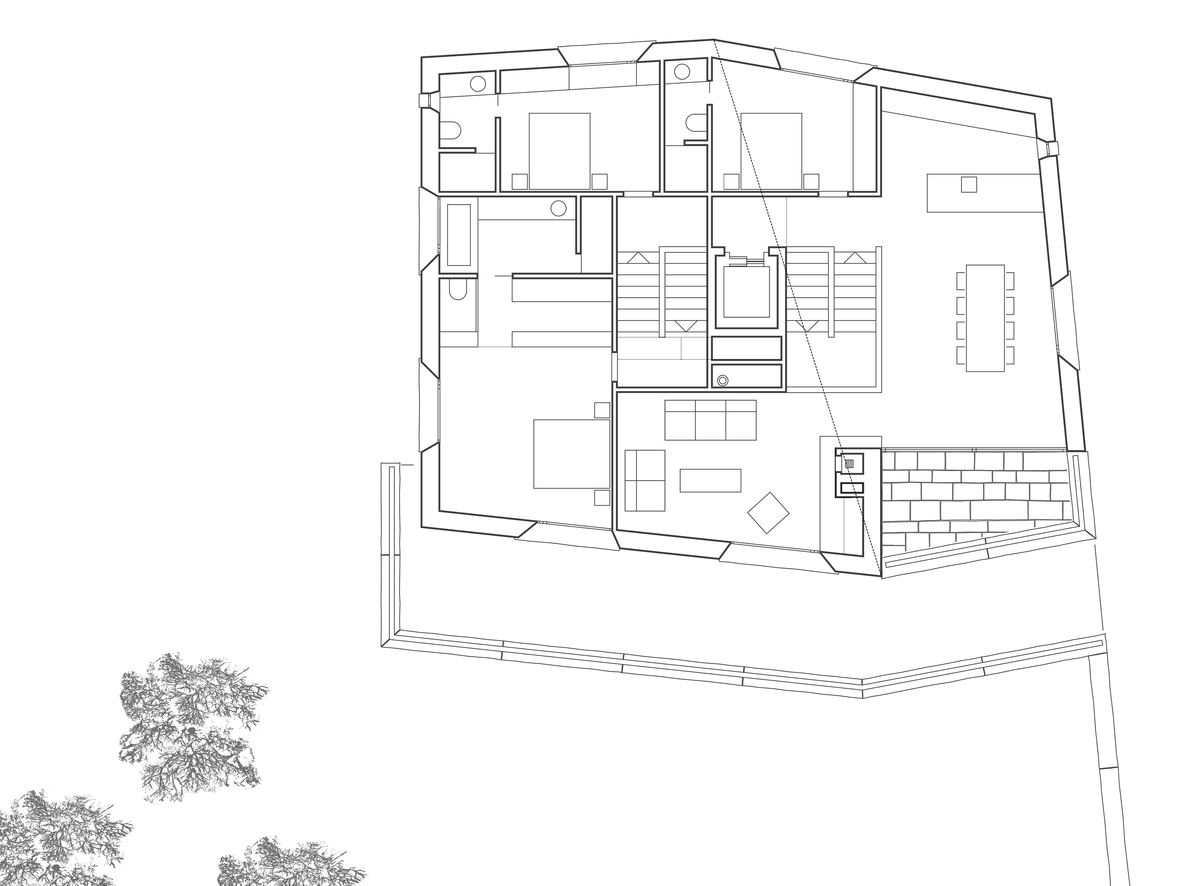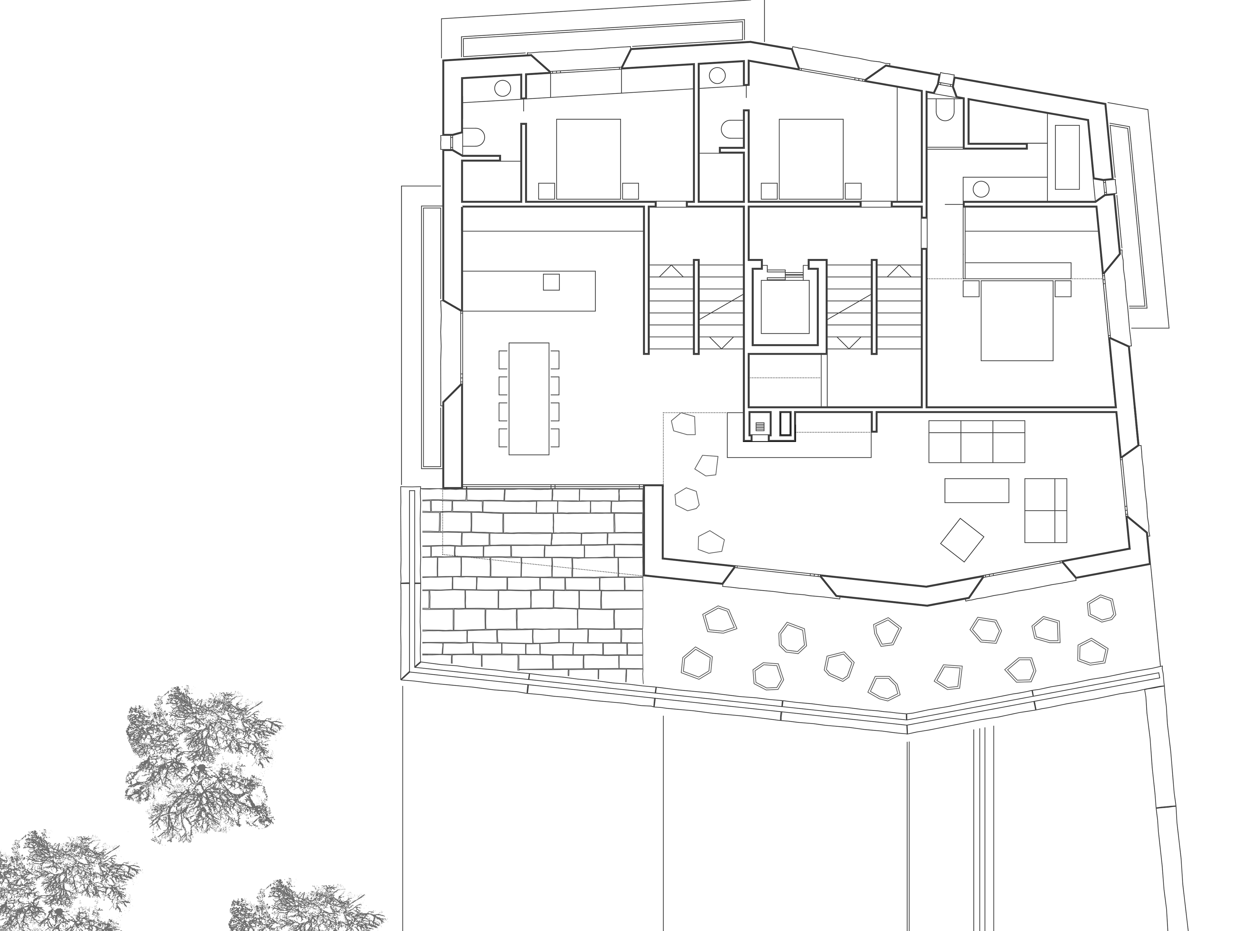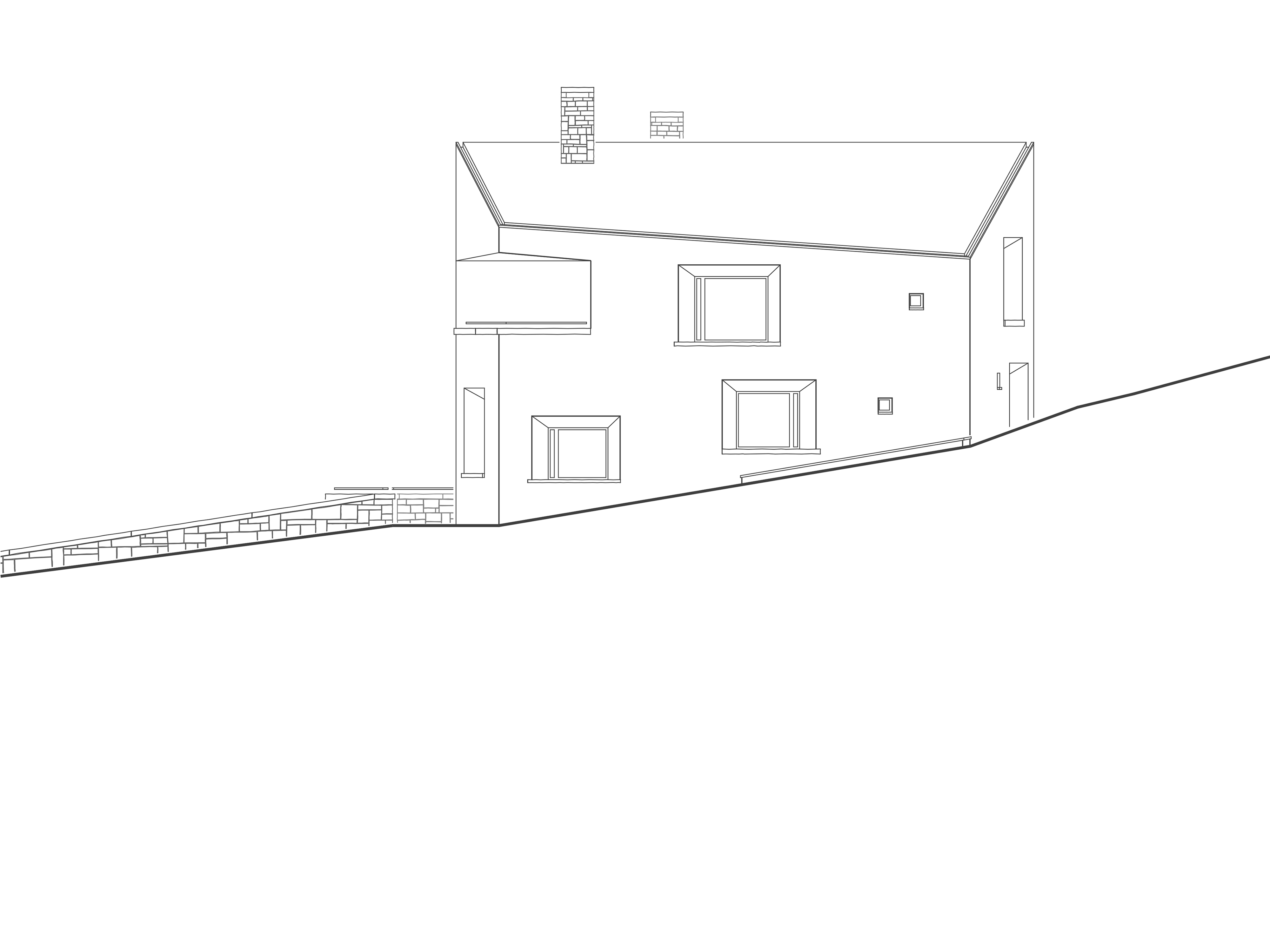 Das Gebäude ist im nördlichen Teil des Grundstücks auf dem alten Bauplatz des ehemaligen «Haus Wieser» platziert, so dass der resultierende Freiraum als vorgelagerter Vorplatz mit Zufahrt, Stellplätzen und Einstellhallenrampe genutzt werden kann. Die entstehenden Funktionsflächen des Aussenraums sind zurückhaltend über die Materialisierung differenziert. Asphaltierte Fahr- und Gehwege, mit Kies belegte Stellflächen und bepflanzte Grünbereiche integrieren sich harmonisch in die bestehende Umgebung. Die Besonderheit des Grundstücks, eine kreuzende Wasserader, wird zum spürbaren Gestaltungselement des Platzes und ist über die Fassung in einem Brunnen mit Rinnenablauf für die Bewohner des Hauses nutzbar gemacht. Der Wasserverlauf über den Vorplatz führt sowohl Bewohner, als auch Besucher zum gedeckten Eingangsbereich mit separierten Zugängen, der sich im Naturstein verkleideten Sockelgeschoss befindet. Es bildet bereits historisch die Basis des Engadiner Hauses und schiebt sich in den natürlich gewachsenen Geländeverlauf des abfallenden Grundstücks. Darauf erheben sich zweigeschossig die zurückversetzten Wohn- und Schlafgeschosse, welche sich nicht nur über ihre Setzung, sondern auch materiell über die graue Kalkputzfassade vom rohen Granitstein des Sockelgeschosses absetzen. Den oberen Abschluss des Hauses bildet ein Satteldach, dessen matte Rheinzink-Metalldeckung sich an die Architektursprache der umgebenden Häuser anlehnt.