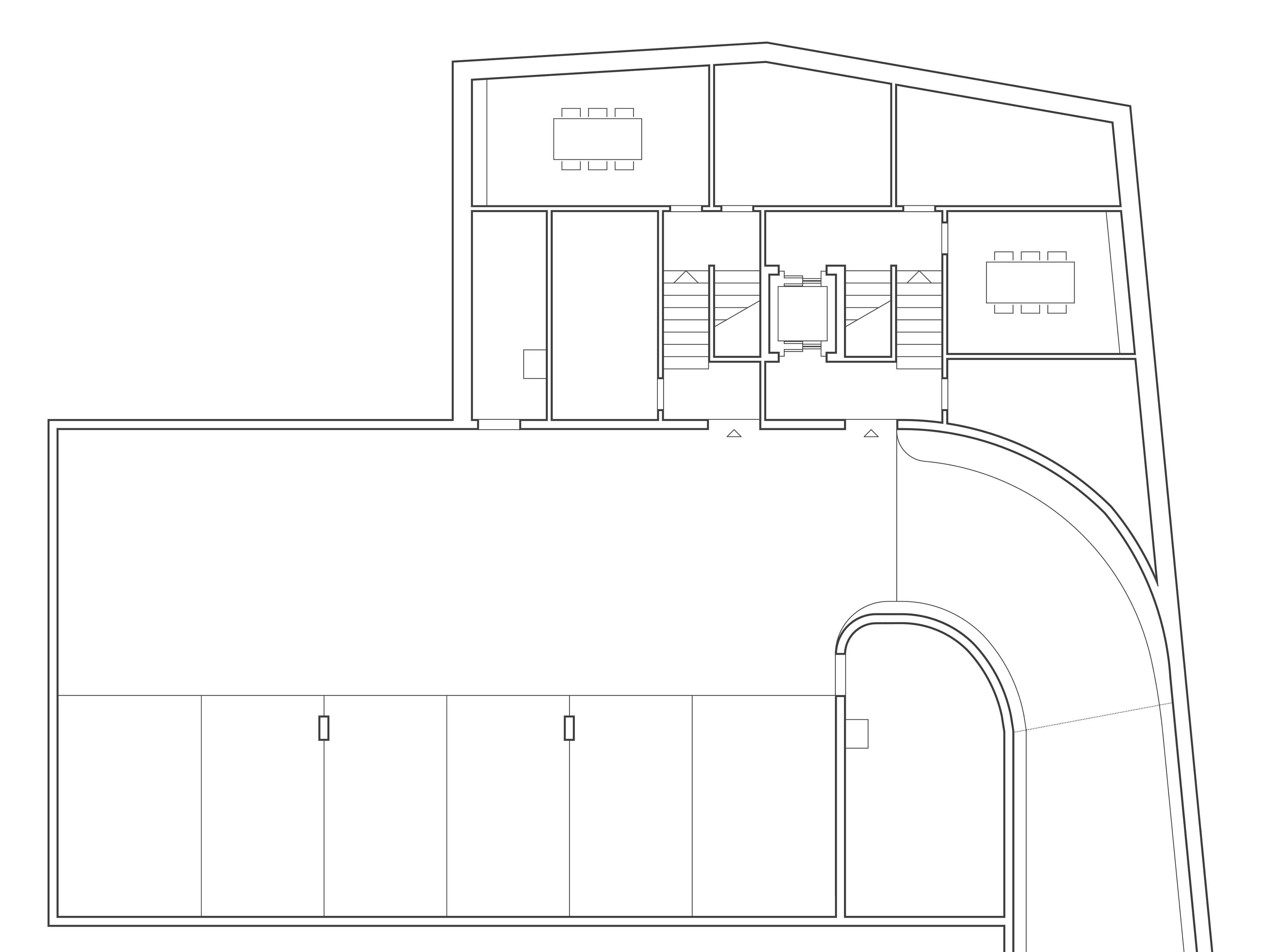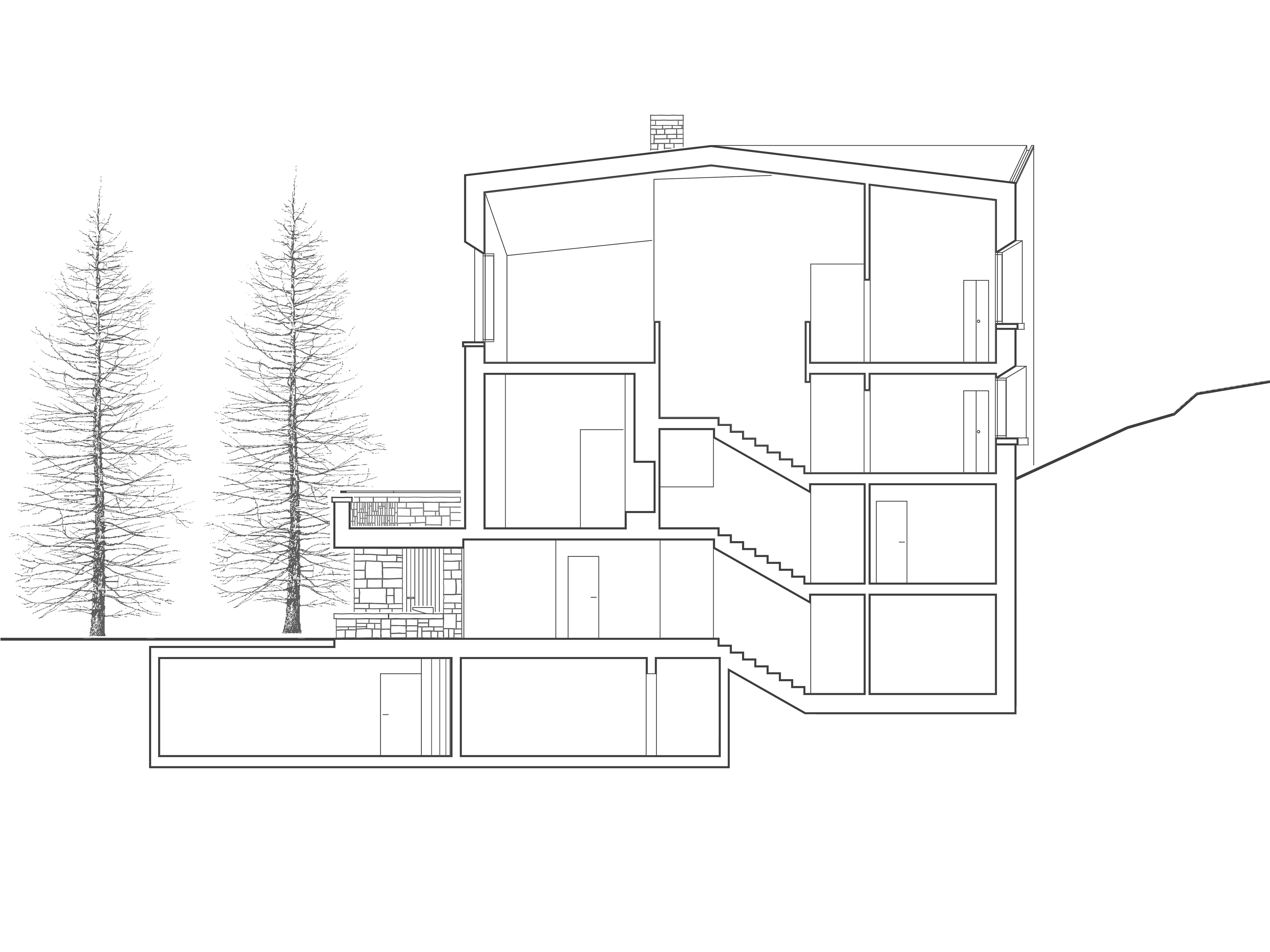 Im Inneren sind zwei 5-Zimmerwohnungen untergebracht, die sich via Split Level auf insgesamt vier Hauptgeschosse erstrecken. Im Untersten befinden sich die Einstellhalle mit je 3 Stellplätzen, Velo-, Lager- und Waschräume, sowie je ein Weinkeller. Die separaten Zugänge und das getrennte Treppenhaus bieten ein hohes Mass an Privatsphäre und ermöglichen ein ungestörtes «Nebeneinanderwohnen» beider Parteien, welches über die Liftanlage auch barrierefrei gestaltet werden kann. Zu den Wohnungen gehören nebst Wohn-, Ess- und Schlafzimmern mit zugehörigen Sanitärbereichen eine integrierte, offene Küche, ein Medienzimmer und ein Wellness- und Spabereich mit grosszügiger Sauna. Eine besondere Qualität des Hauses sind die verschiedenen Blickbeziehungen in die archaische Berglandschaft, sowie die Möglichkeit der Interaktion durch Sitzplatz und Balkon. Eine eindrückliche Lichtführung über die trapezförmigen Oberlichter im Eingangsbereich, die langgezogenen Oberlichter in Medien- und Wellnessräumen und das beiden Wohnungen zugeordnete Oberlicht im Treppenraum ist charakteristischer Bestandteil des Hauses und bewirkt eine stimmungsvolle Atmosphäre. Zentraler Anziehungspunkt ist der traditionelle Stubenofen mit integrierter Sitzbank im überhöhten Wohn- und Gemeinschaftsraum. Beide Wohnungen bieten individuelle räumliche Qualitäten mit variierenden Raumhöhen, welche von schlichten weiss verputzen Decken und Wänden und naturbelassenen Holzböden gefasst werden.