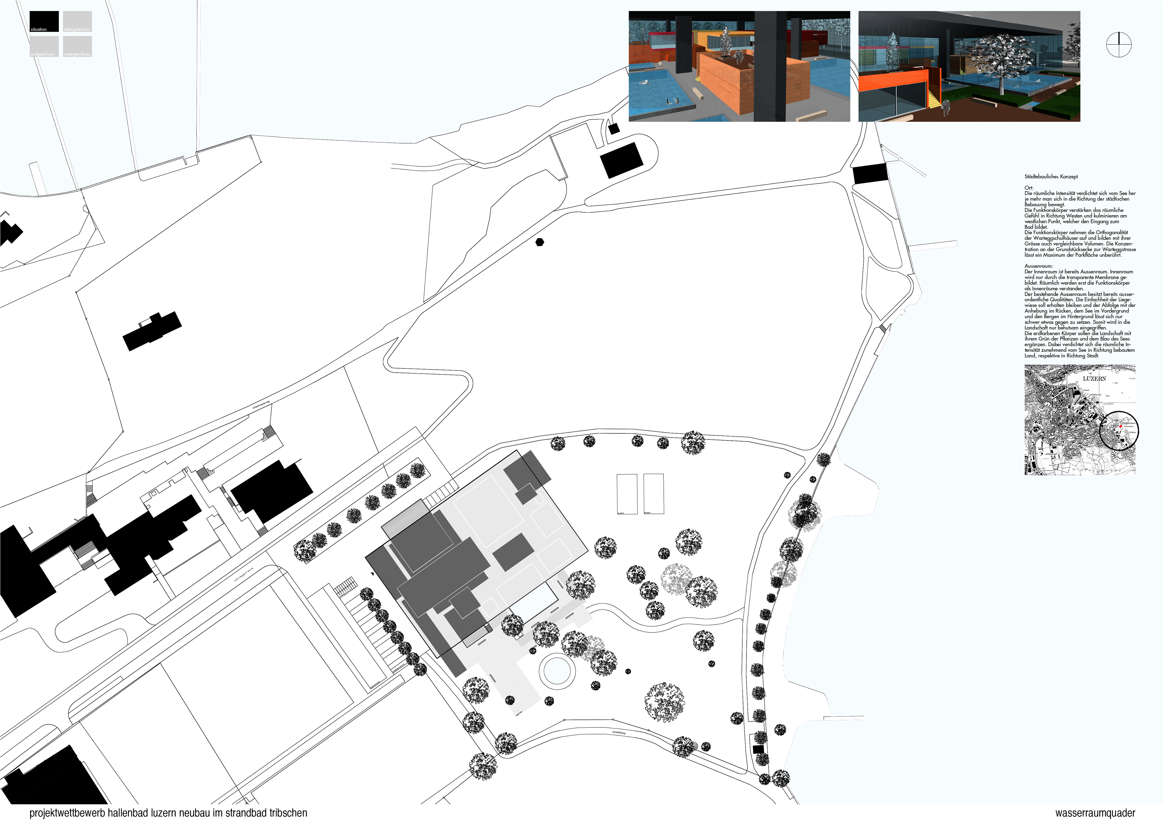 Der Innenraum ist bereits Aussenraum. Innenraum wird nur durch die transparente Membrane gebildet. Räumlich werden erst die Funktionskörper als Innenräume verstanden. Der bestehende Aussenraum besitzt bereits ausserordentliche Qualitäten. Die Einfachheit der Liegwiese soll erhalten bleiben und der Abfolge mit der Anhebung im Rücken, dem See im Vordergrund und den Bergen im Hintergrund lässt sich nur schwer etwas gegen zu setzen. Somit wird in die Landschaft nur behutsam eingegriffen.