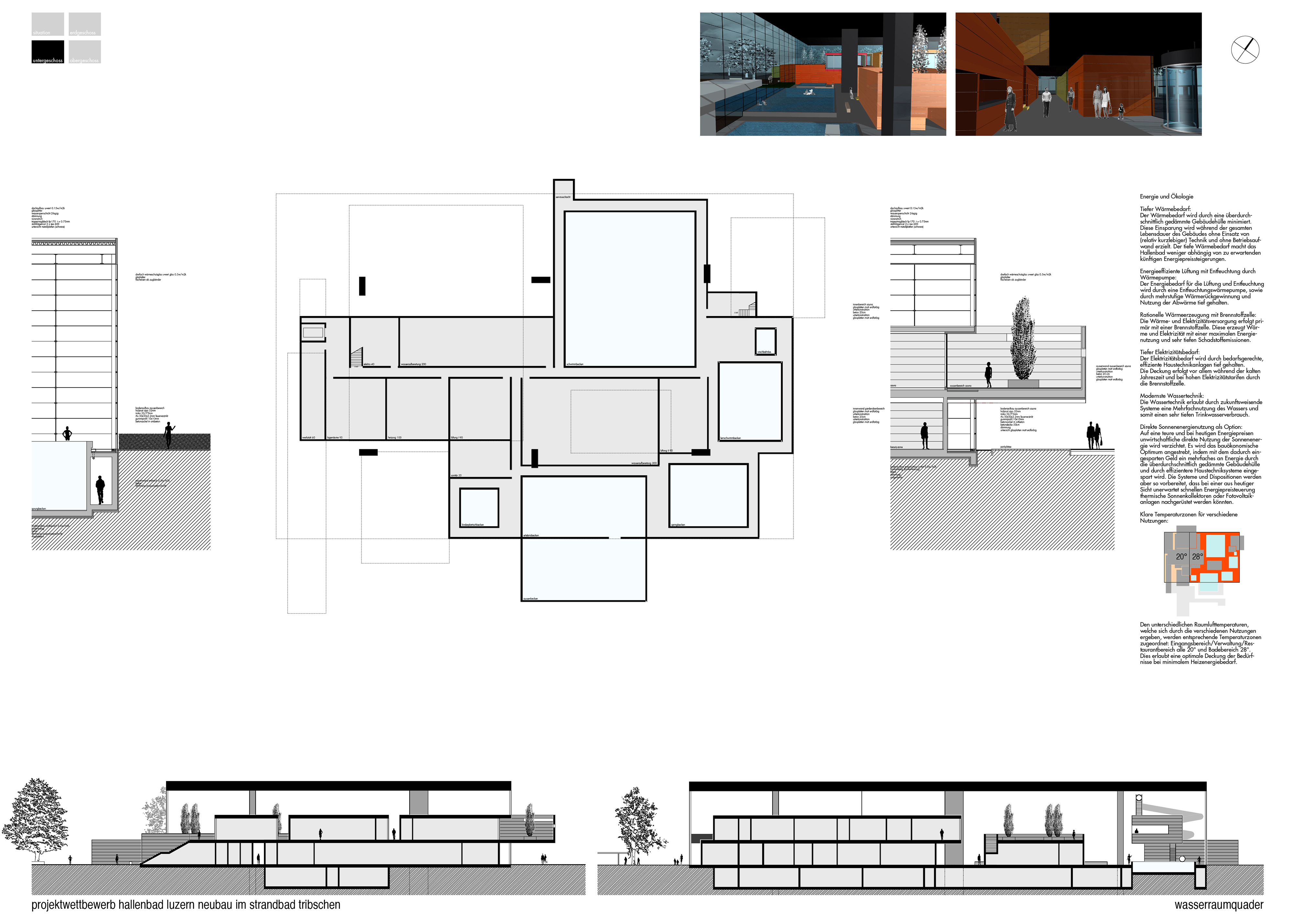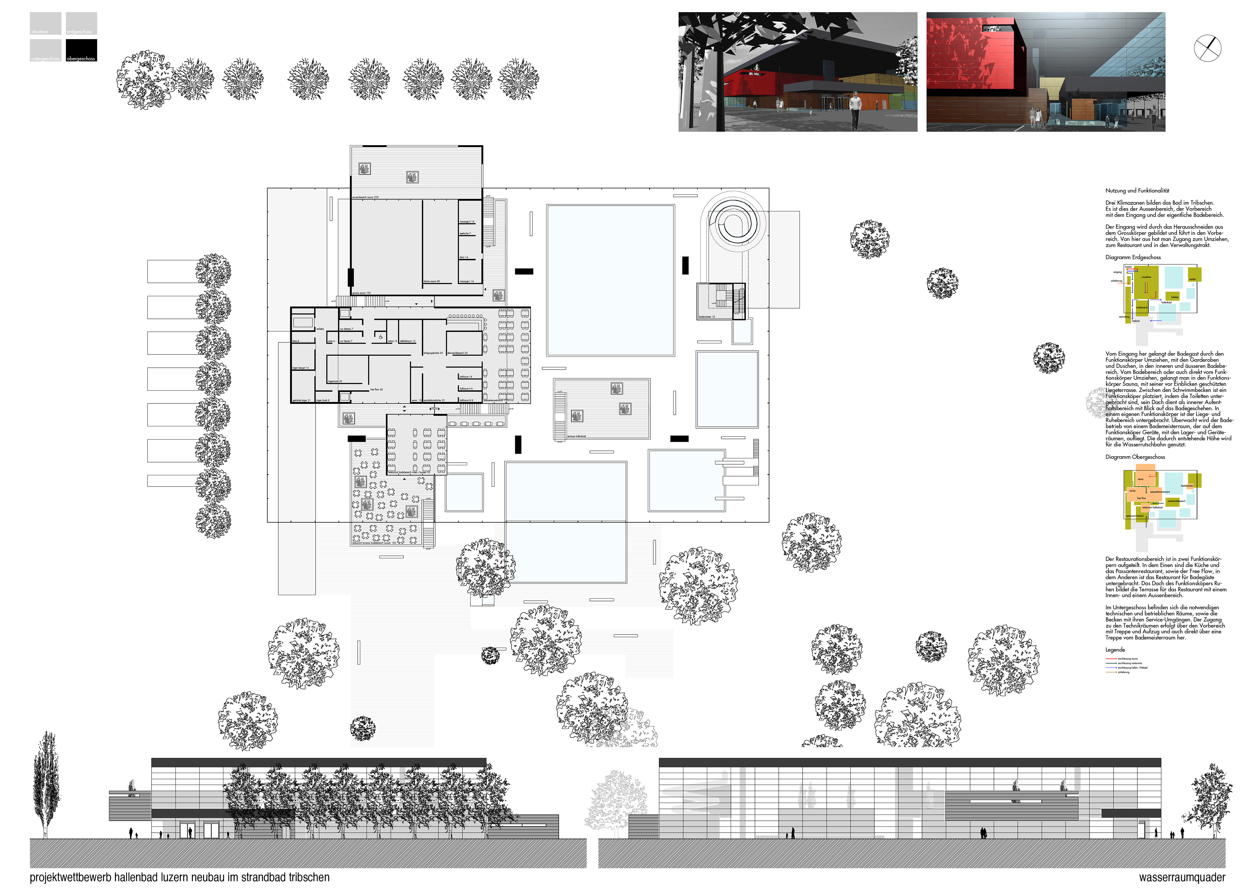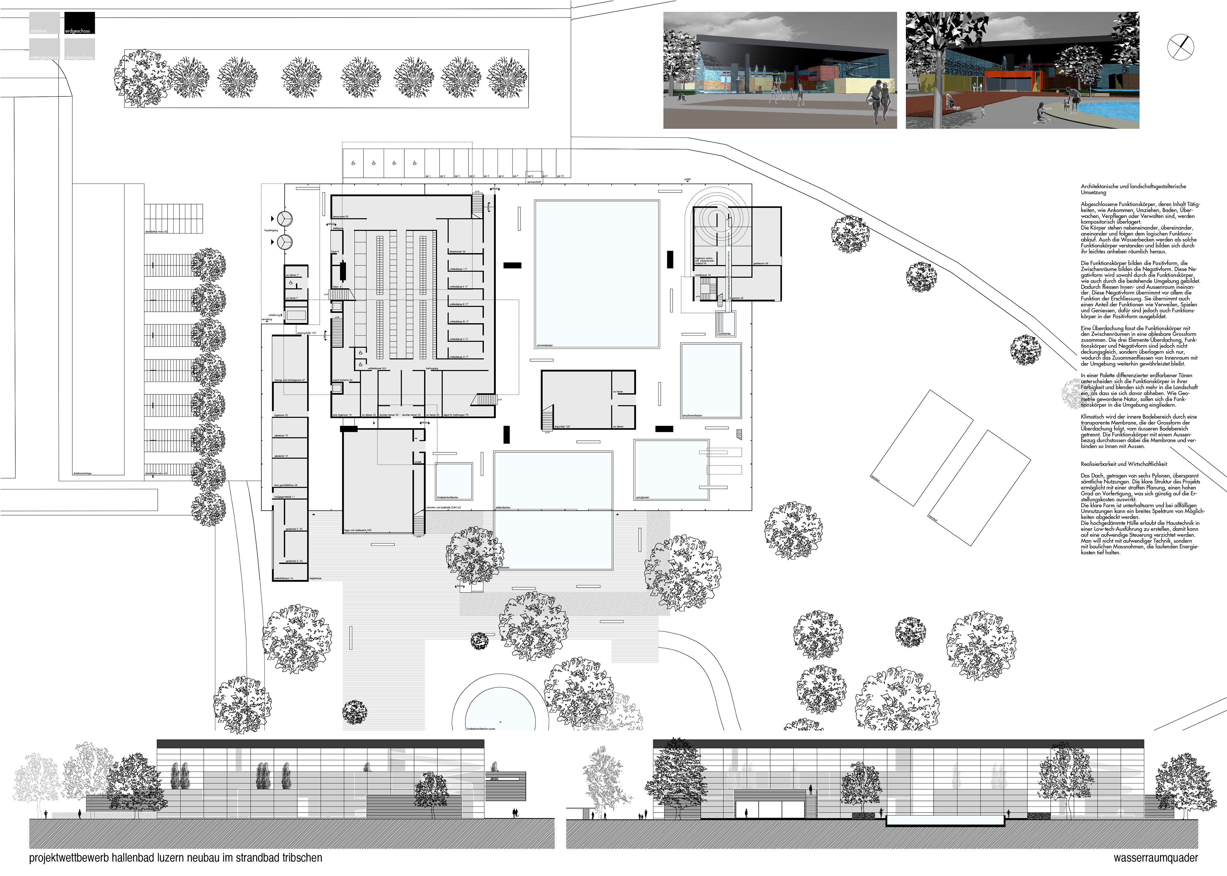 Abgeschlossene Funktionskörper, deren Inhalt Tätigkeiten, wie Ankommen, Umziehen, Baden, Überwachen, Verpflegen oder Verwalten sind, werden kompositorisch überlagert. Die Körper stehen nebeneinander, übereinander, aneinander und folgen dem logischen Funktionsablauf. Auch die Wasserbecken werden als solche Funktionskörper verstanden und bilden sich durch ihr leichtes anheben räumlich heraus.
