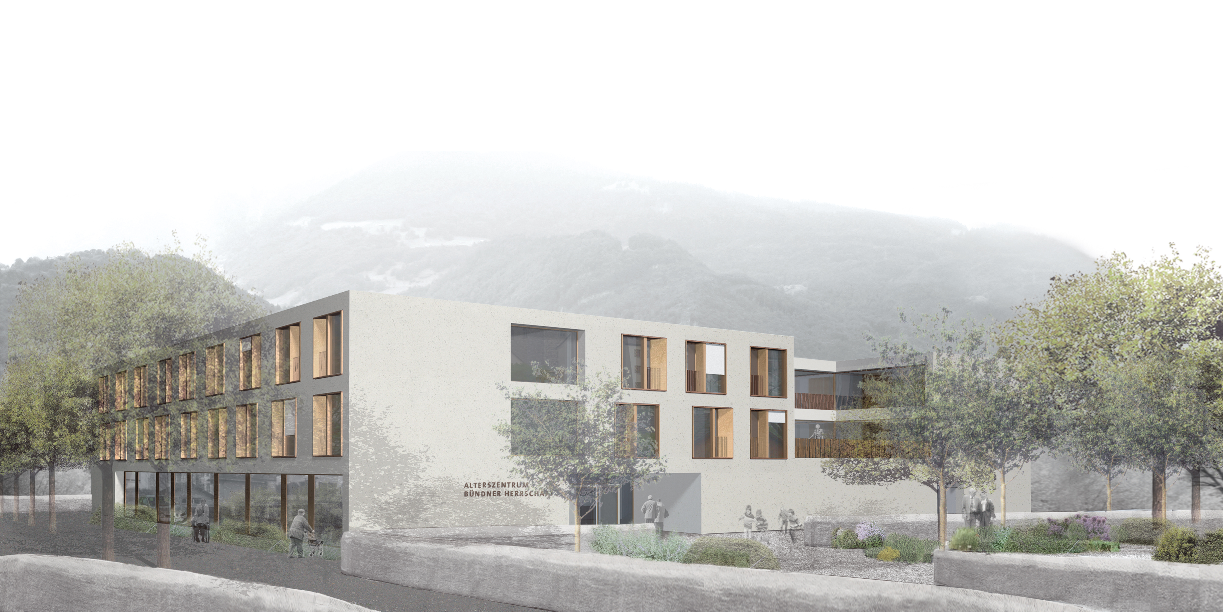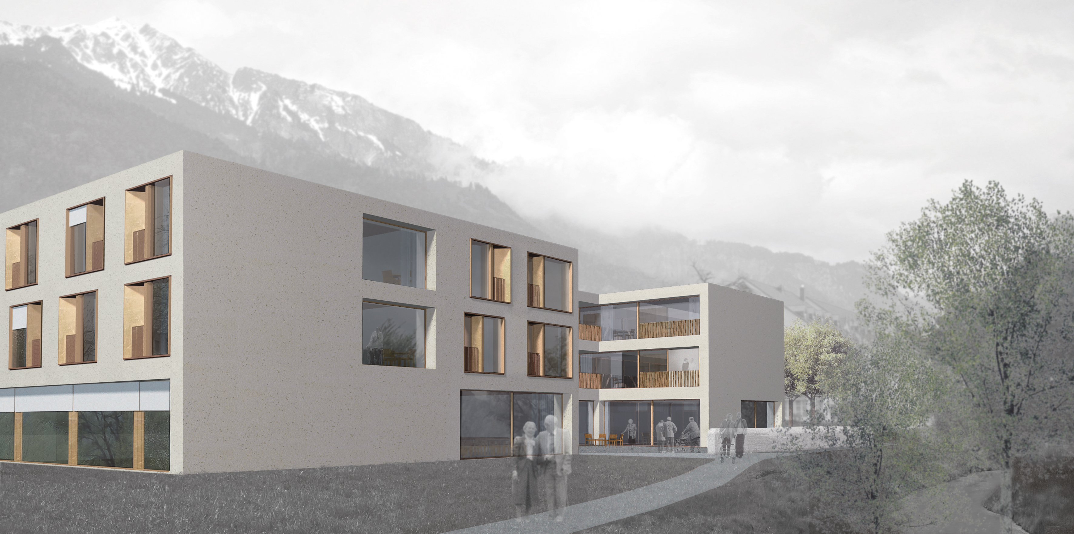 Der Neubau soll als Massivbau mit einer Ortbetonfassade und einem extensiv begrünte Flachdach ausgeführt werden. Die raue, sandgestrahlte Oberfläche und die Begrünung nehmen die Beziehung mit der umliegenden Berglandschaft auf, erinnert aber auch an historische Steinbauten und ihre Gärten. Der massive Baukörper gibt der öffentlichen Nutzung ein angemessenes Gewicht. Die grossen Holzmetallfenster sind aussen mit einer behandelten Bronzeoberfläche gedacht. Sie verleihen dem Haus Wärme und Geborgenheit. In den Betagtenzimmern erinnern die Fensterelemente durch ihre räumliche Tiefe an Holzmöbel. Auch die jeweiligen Zimmereingänge sind als Holzeinbauten ausgebildet und schaffen zusammen mit dem Parkettboden und den hell verputzten Wänden eine wohnliche Atmosphäre.