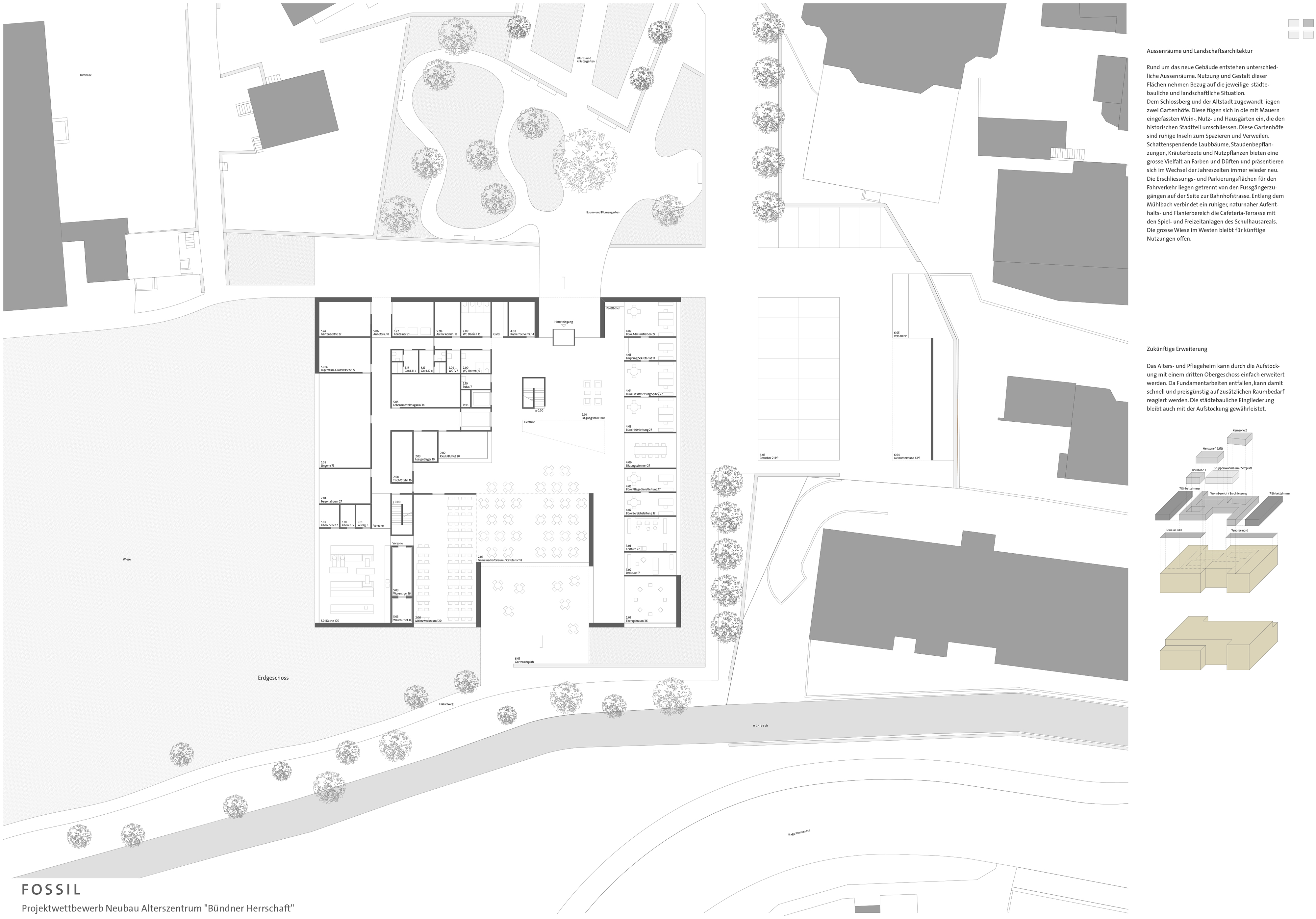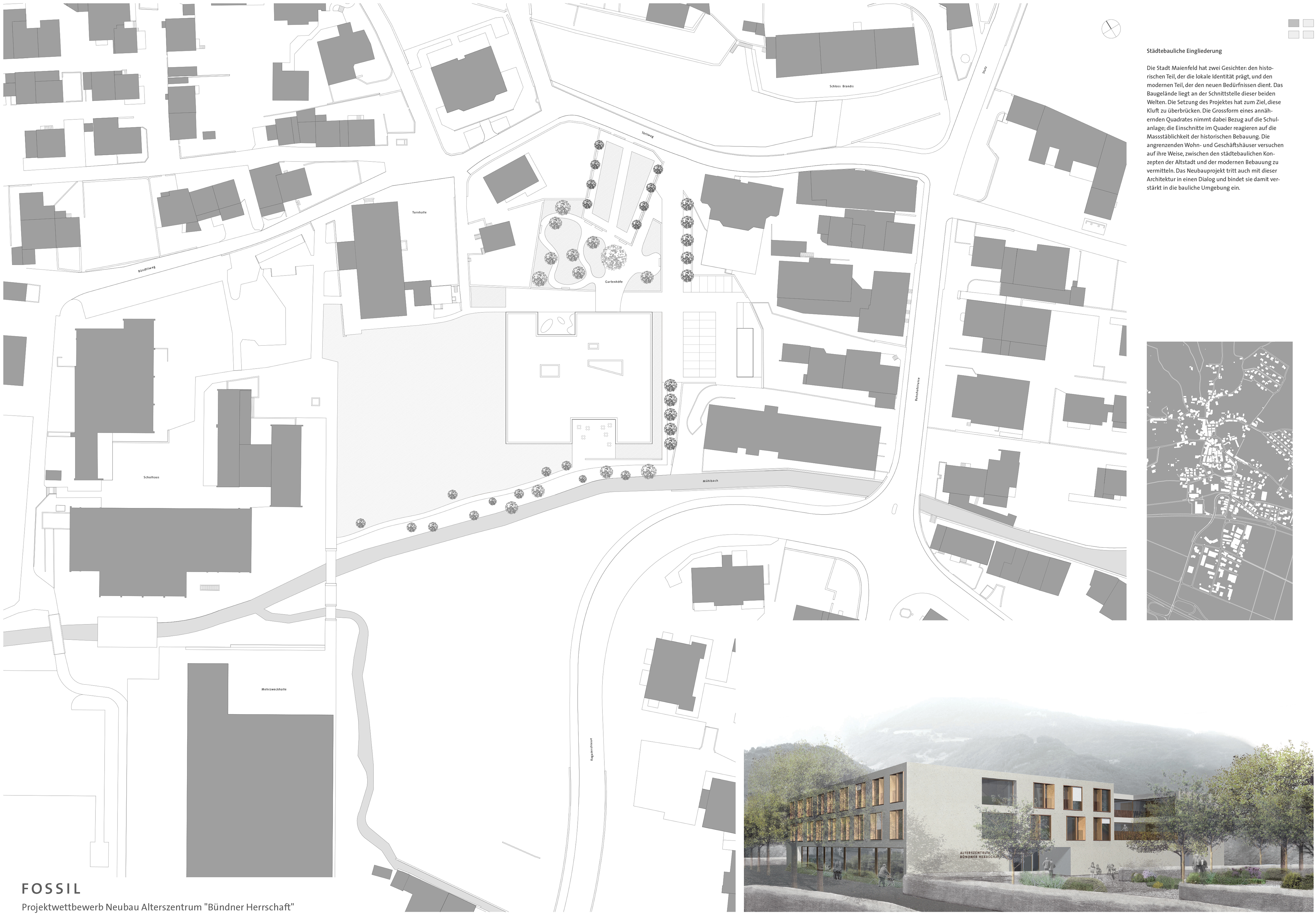 Die Stadt Maienfeld hat zwei Gesichter: den historischen Teil, der die lokale Identität prägt, und den modernen Teil, der den neuen Bedürfnissen dient. Das Baugelände liegt an der Schnittstelle dieser beiden Welten. Die Setzung des Projektes hat zum Ziel, diese Kluft zu überbrücken. Die Grossform eines annähernden Quadrates nimmt dabei Bezug auf die Schulanlage; die Einschnitte im Quader reagieren auf die Massstäblichkeit der historischen Bebauung. Die angrenzenden Wohn- und Geschäftshäuser versuchen auf ihre Weise, zwischen den städtebaulichen Konzepten der Altstadt und der modernen Bebauung zu vermitteln. Das Neubauprojekt tritt auch mit dieser Architektur in einen Dialog und bindet sie damit verstärkt in die bauliche Umgebung ein.