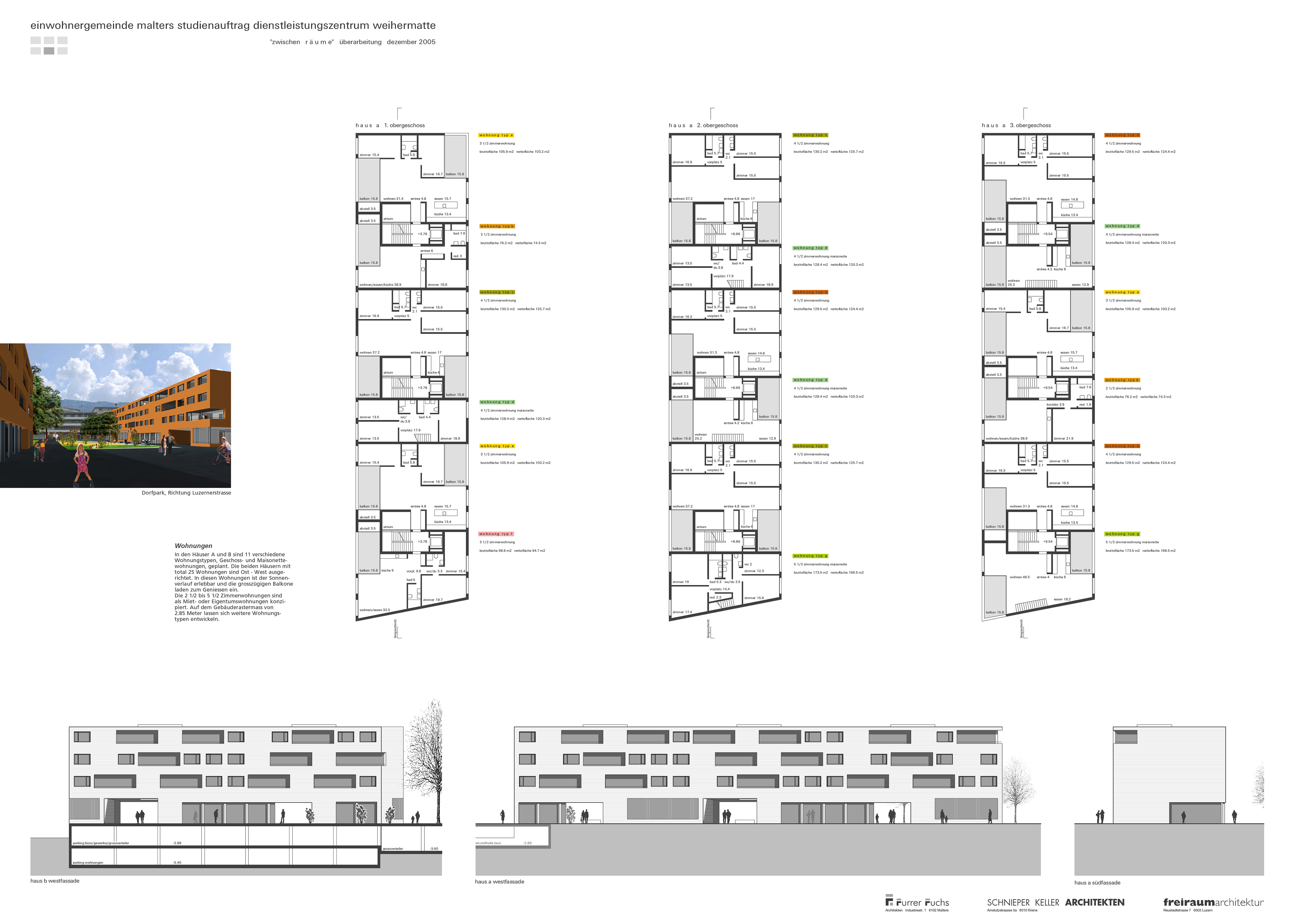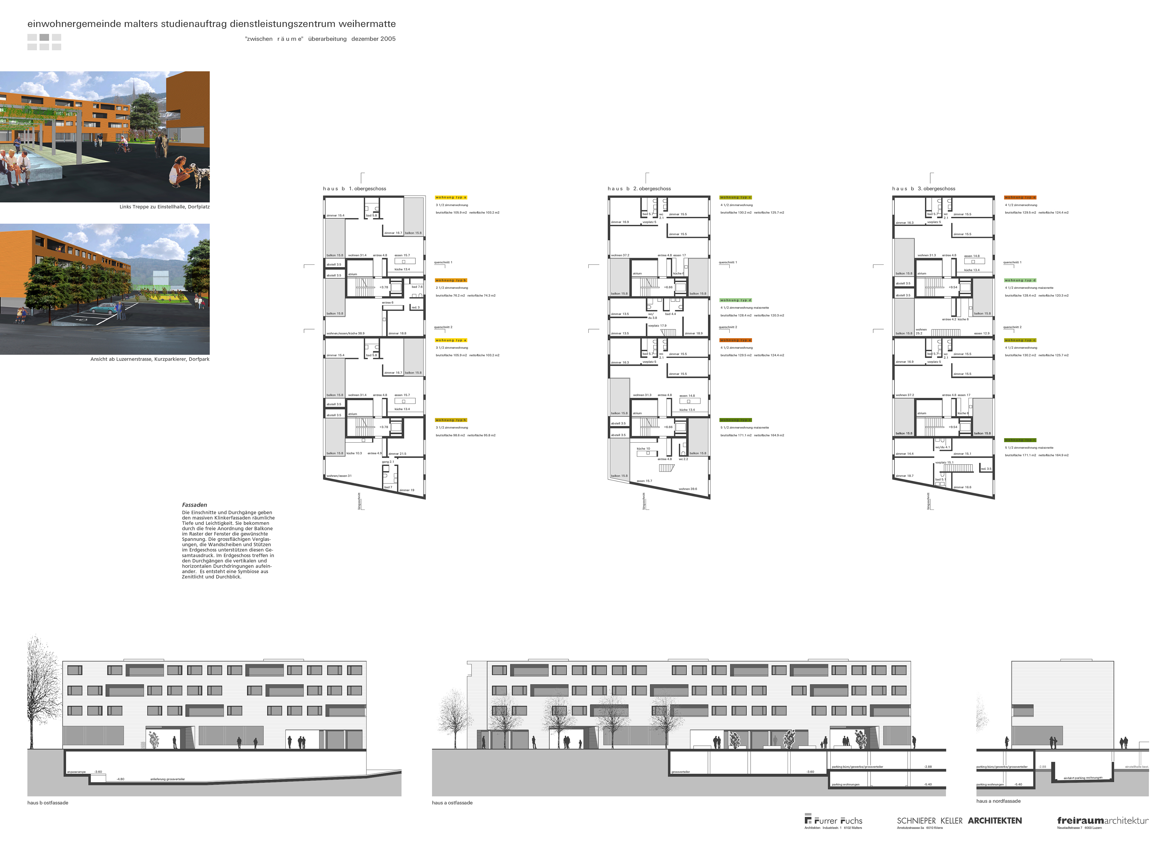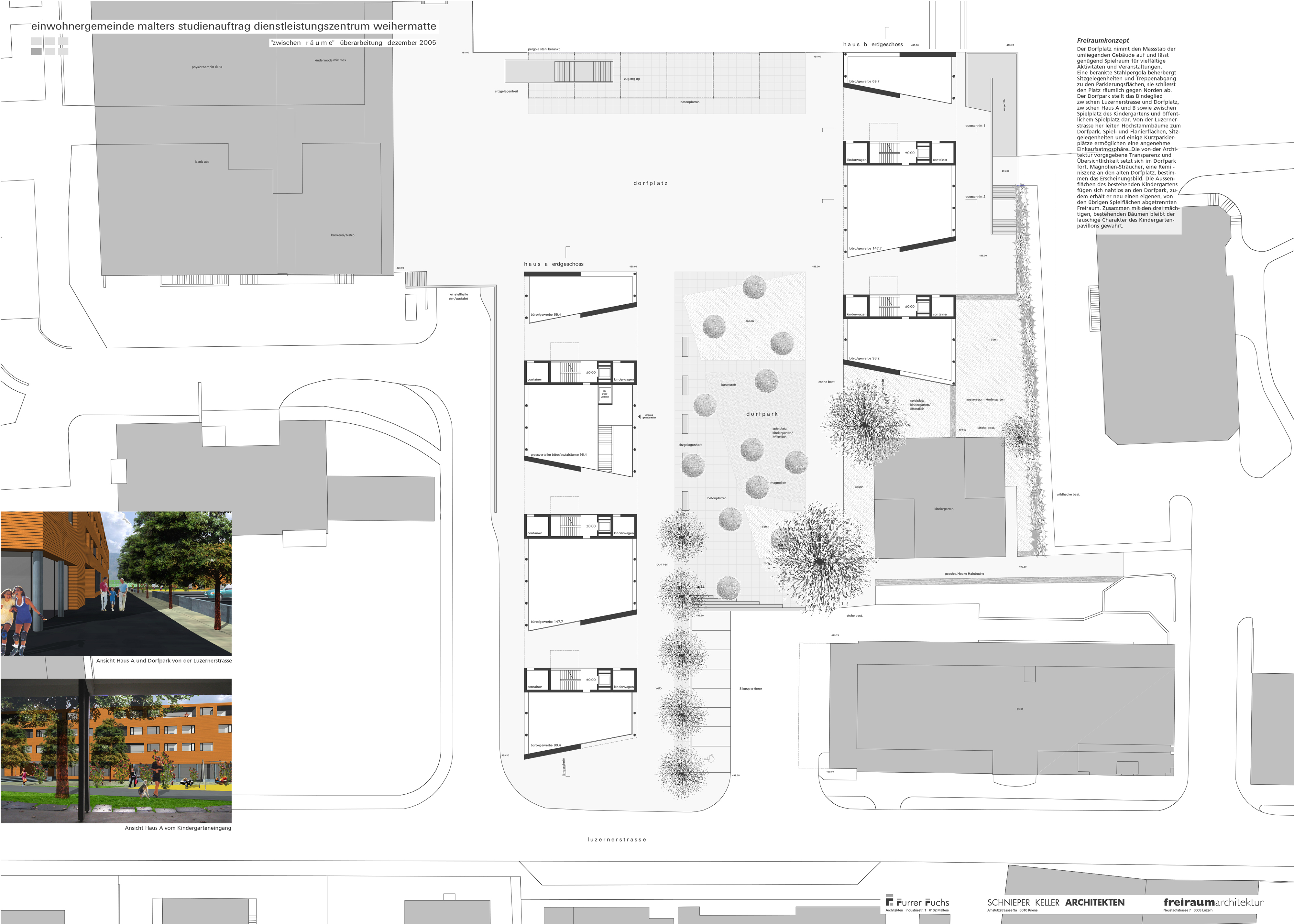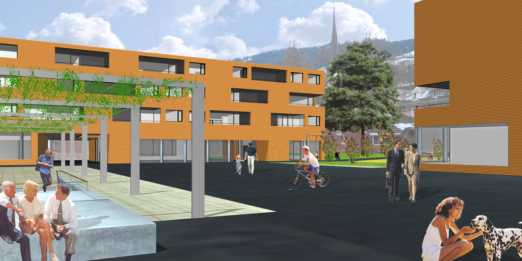 Die hervorstechendsten Qualitäten des Projekts «zwischen r ä u m e» zeigen sich schon mit dem ersten Blick auf den Situationsplan: Geschaffen werden soll ein ganzes Ensemble von unterschiedlich qualifizierten, ausstaffierten und miteinander eng verwobenen Aussenräumen. Freie Beweglichkeit im Erdgeschoss zwischen gedeckten und offenen, intimen und öffentlicheren, begrünten und leer gelassenen, eng definierten und weit geöffneten Abschnitten ist das Thema des neu zu schaffenden Dorfplatzes. Wechsel von Flanieren, Verweilen. Bei dieser städtebaulich überzeugenden Idee bleibt allerdings zu prüfen, ob erstens die gedeckten Zonen unter den Häusern klimatisch angenehm (ohne allzu heftigen Durchzug) sind, und ob es, zweitens, nicht angebrachter wäre, sie visuell noch mit anderen als den vorgeschlagenen Erschliessungszonen auszustatten.