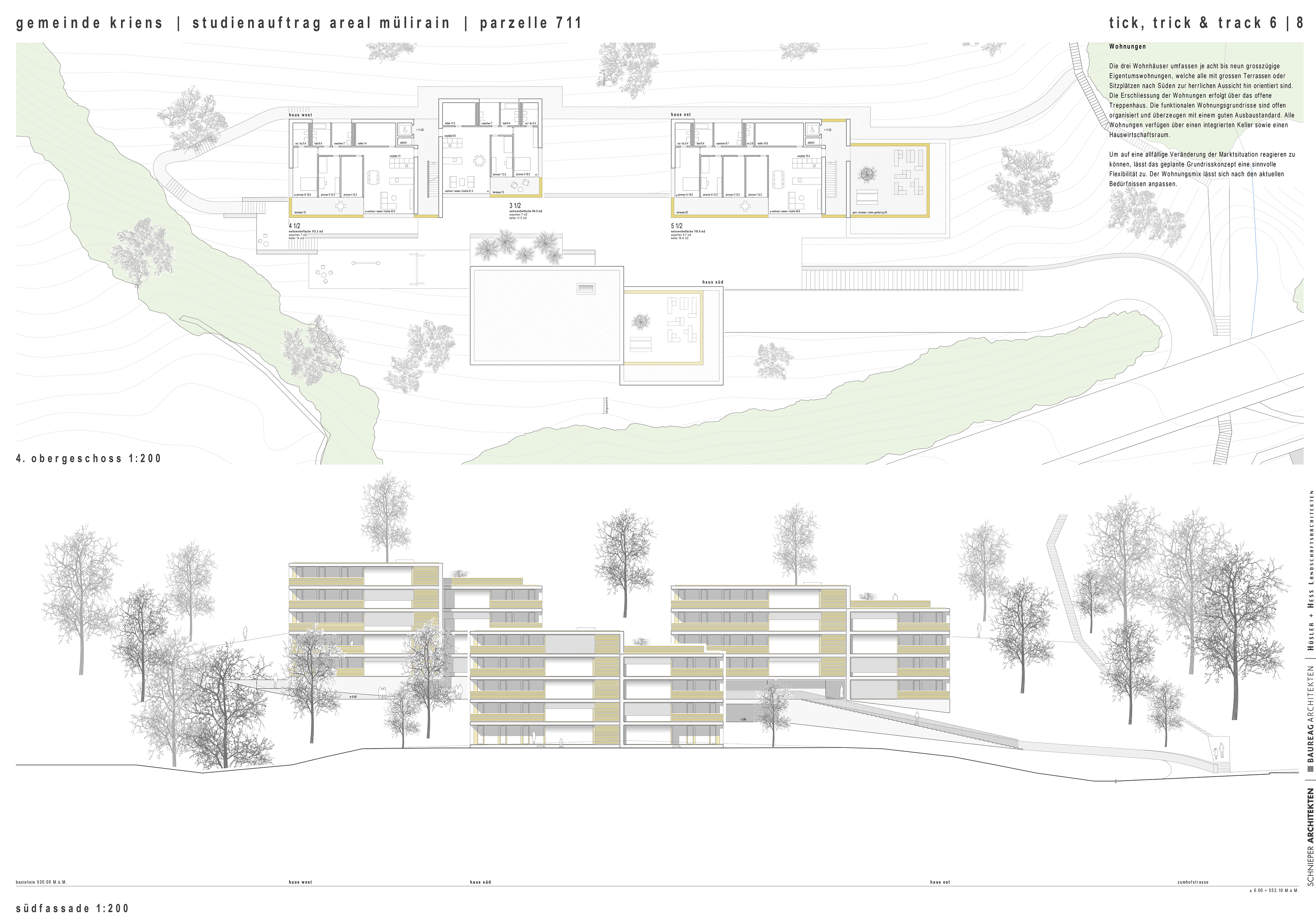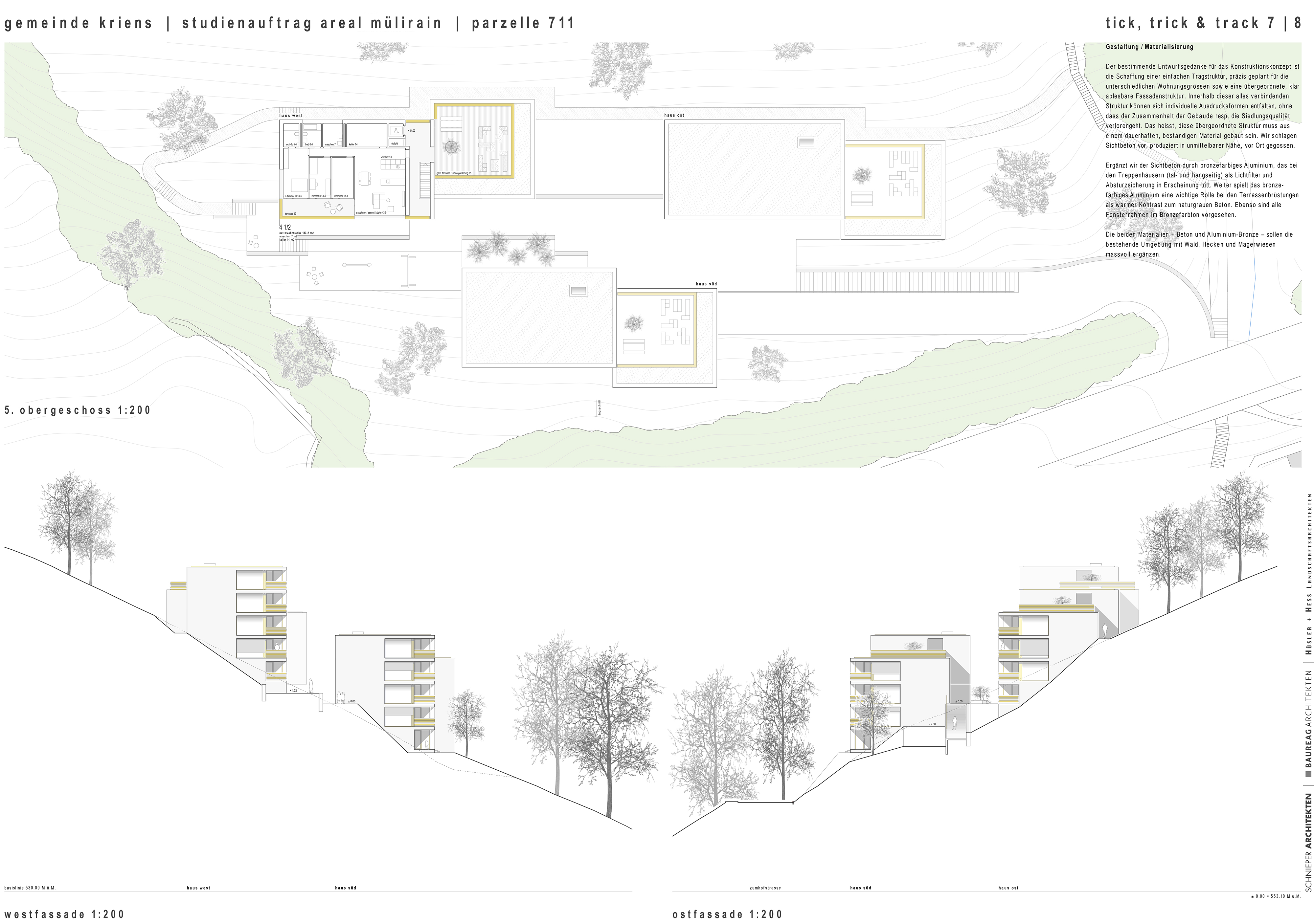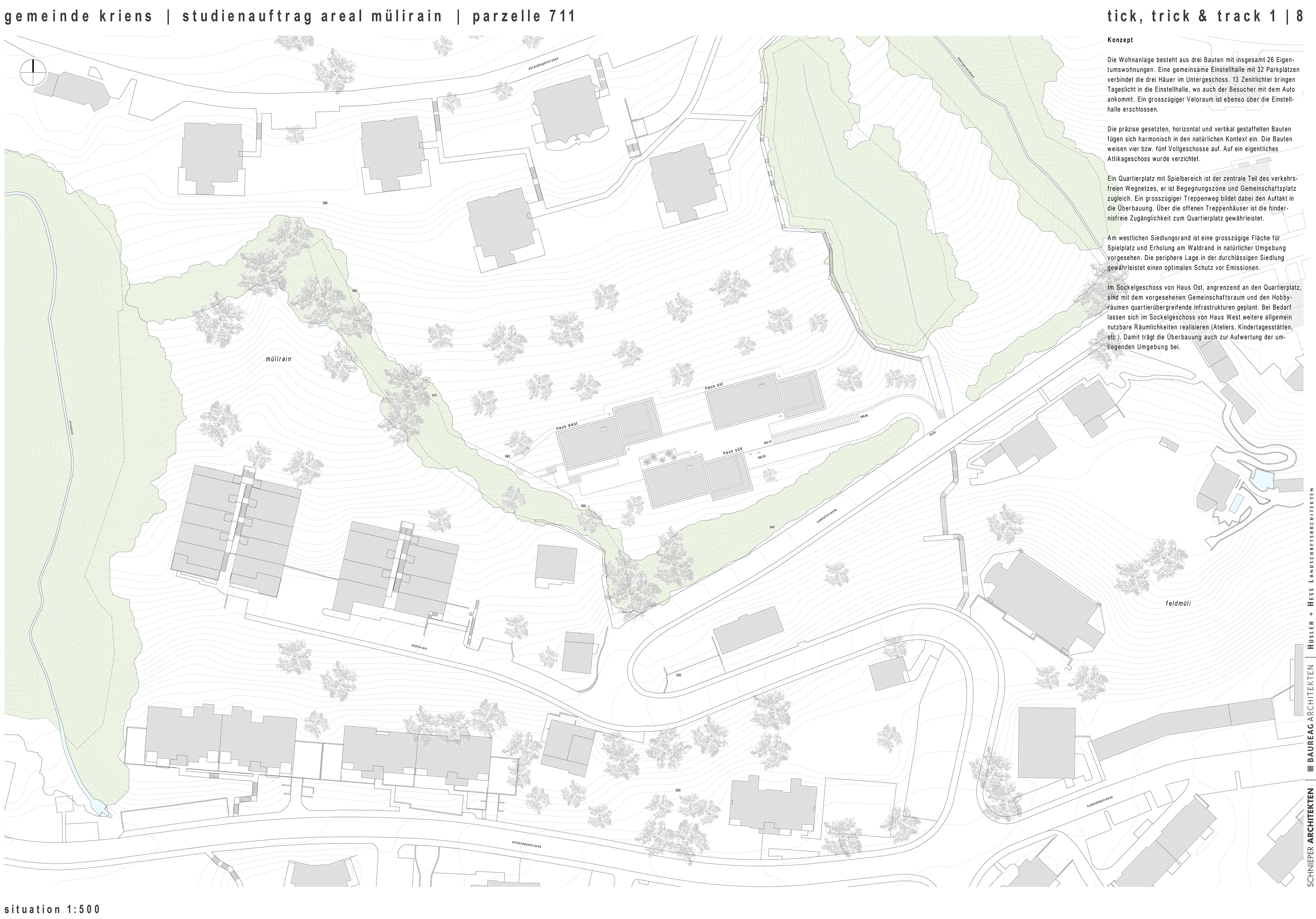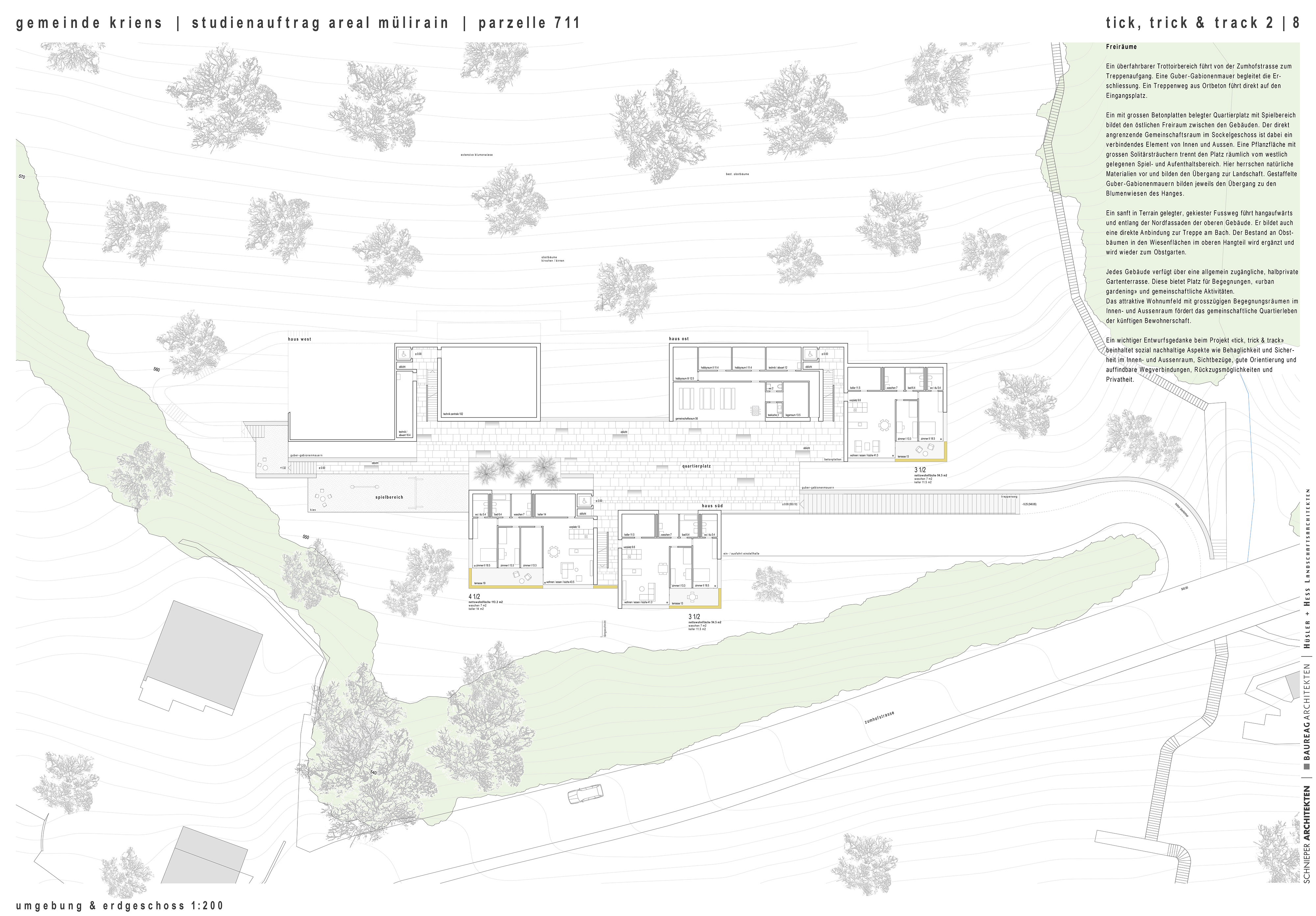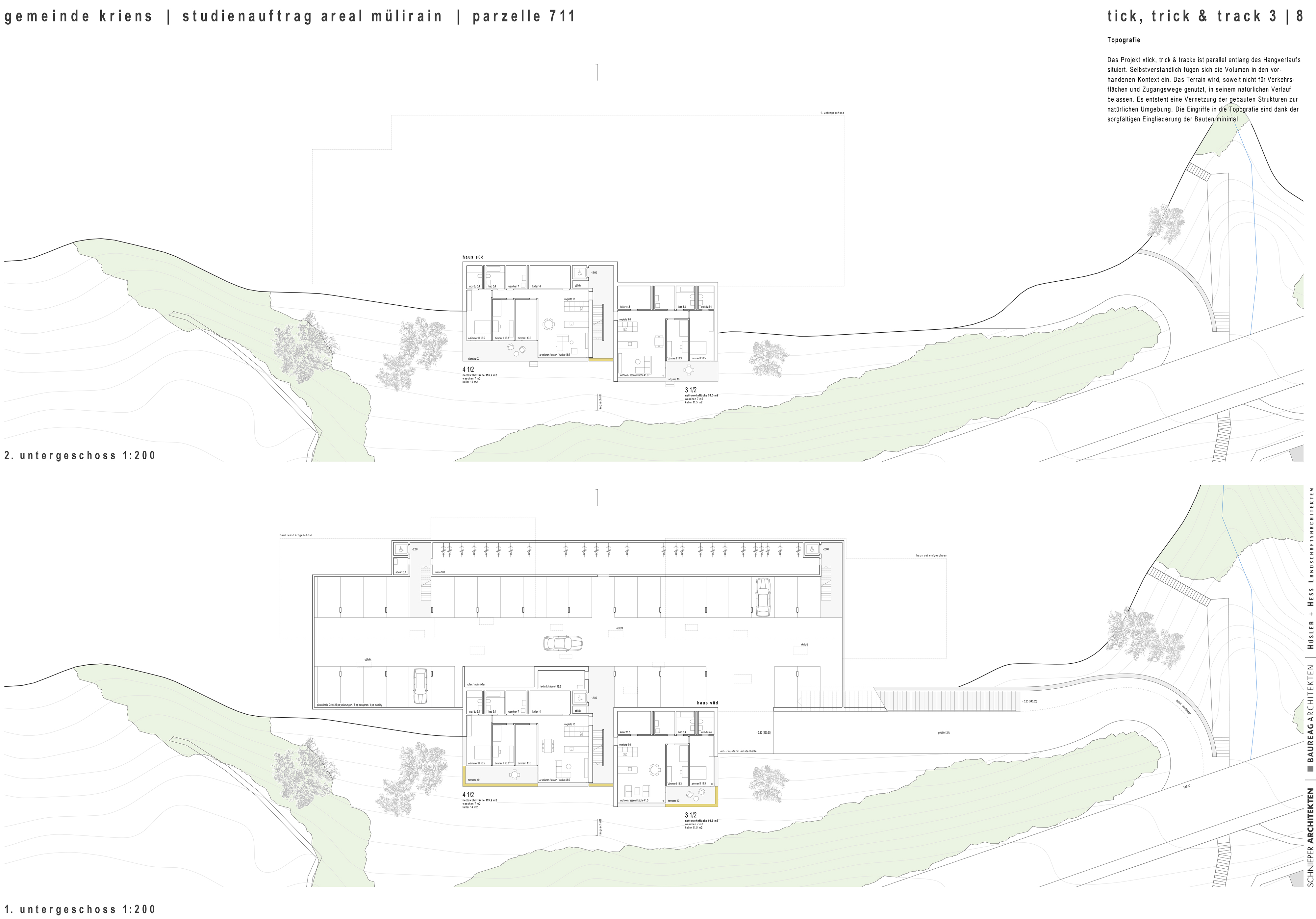 Das Projekt «tick, trick & track» ist parallel entlang des Hangverlaufs situiert. Selbstverständlich fügen sich die Volumen in den vorhandenen Kontext ein. Das Terrain wird, soweit nicht für Verkehrsflächen und Zugangswege genutzt, in seinem natürlichen Verlauf belassen. Es entsteht eine Vernetzung der gebauten Strukturen zur natürlichen Umgebung. Die Eingriffe in die Topografie sind dank der sorgfältigen Eingliederung der Bauten minimal.