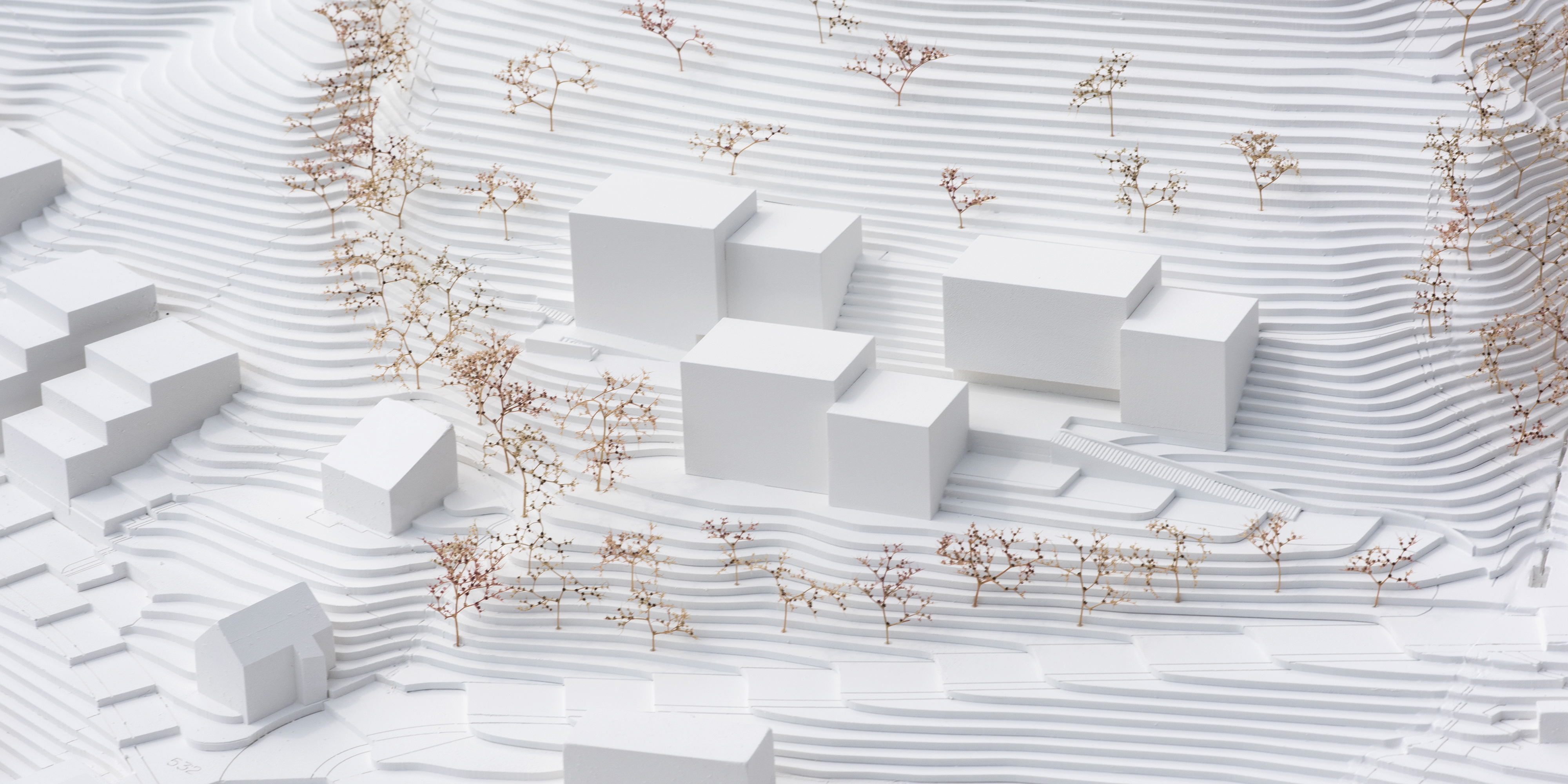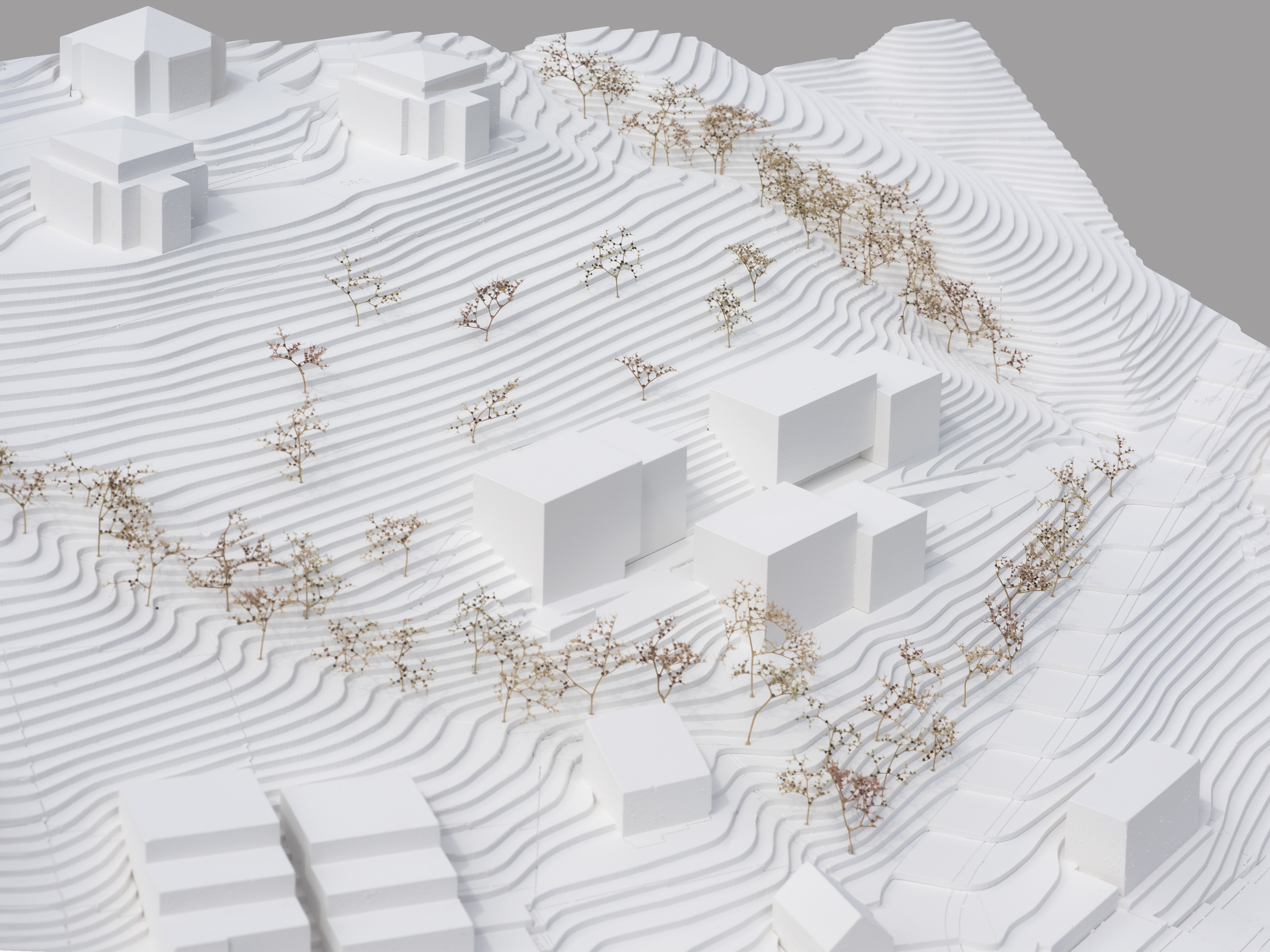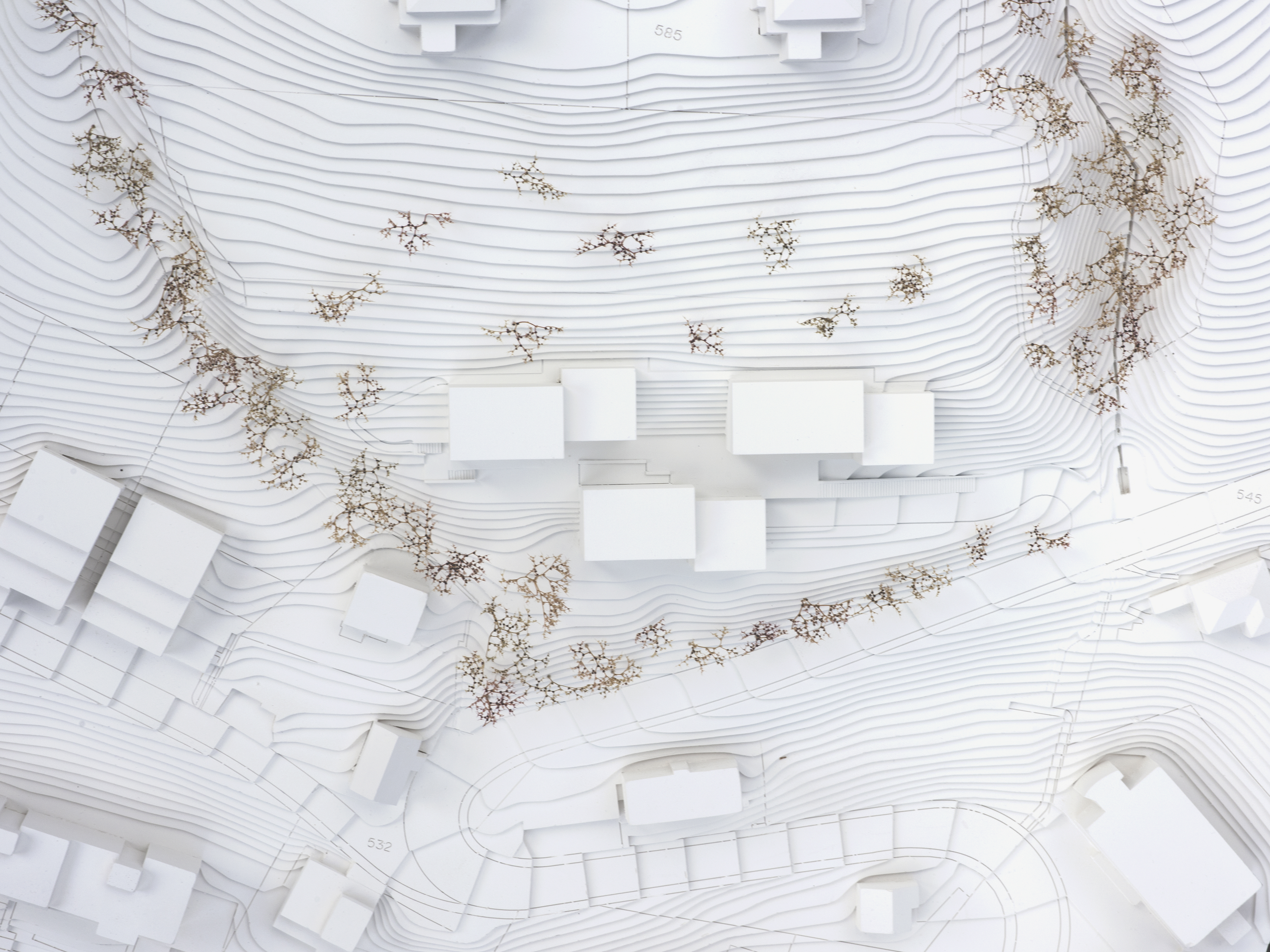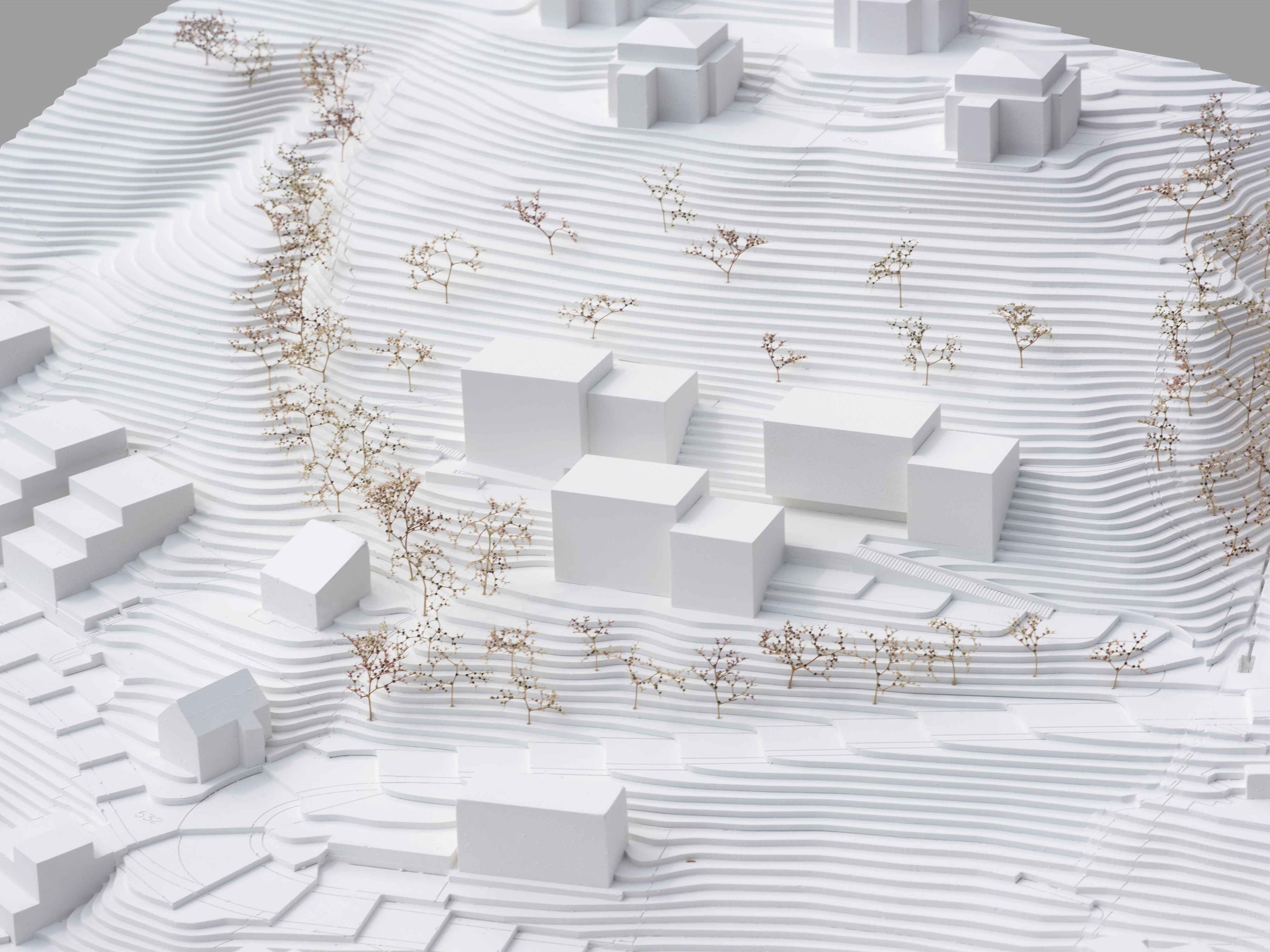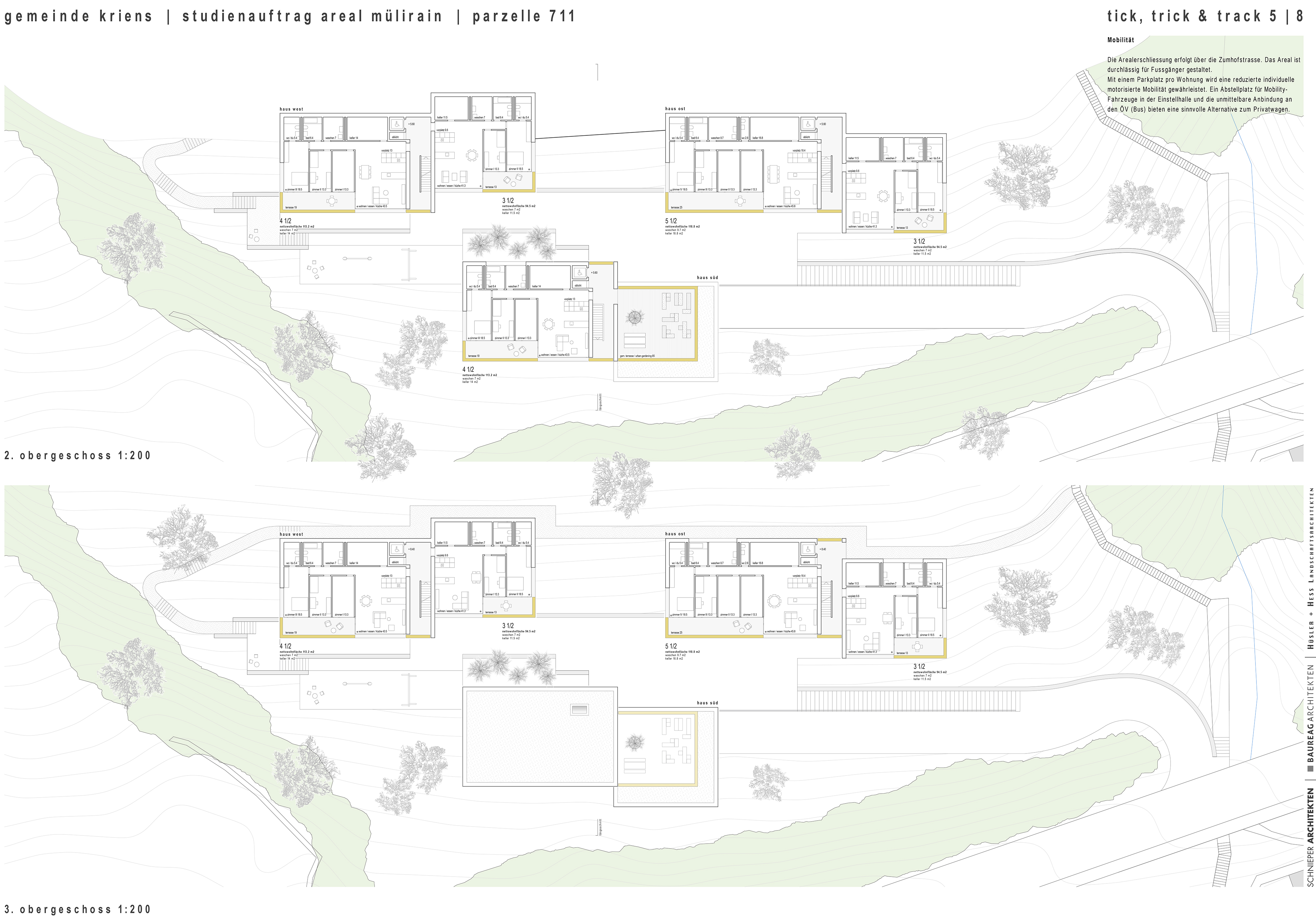 Das Projekt «tick, trick & track» ist parallel entlang des Hangverlaufs situiert. Selbstverständlich fügen sich die Volumen in den vorhandenen Kontext ein. Das Terrain wird, soweit nicht für Verkehrsflächen und Zugangswege genutzt, in seinem natürlichen Verlauf belassen. Es entsteht eine Vernetzung der gebauten Strukturen zur natürlichen Umgebung. Die Eingriffe in die Topografie sind dank der sorgfältigen Eingliederung der Bauten minimal.
