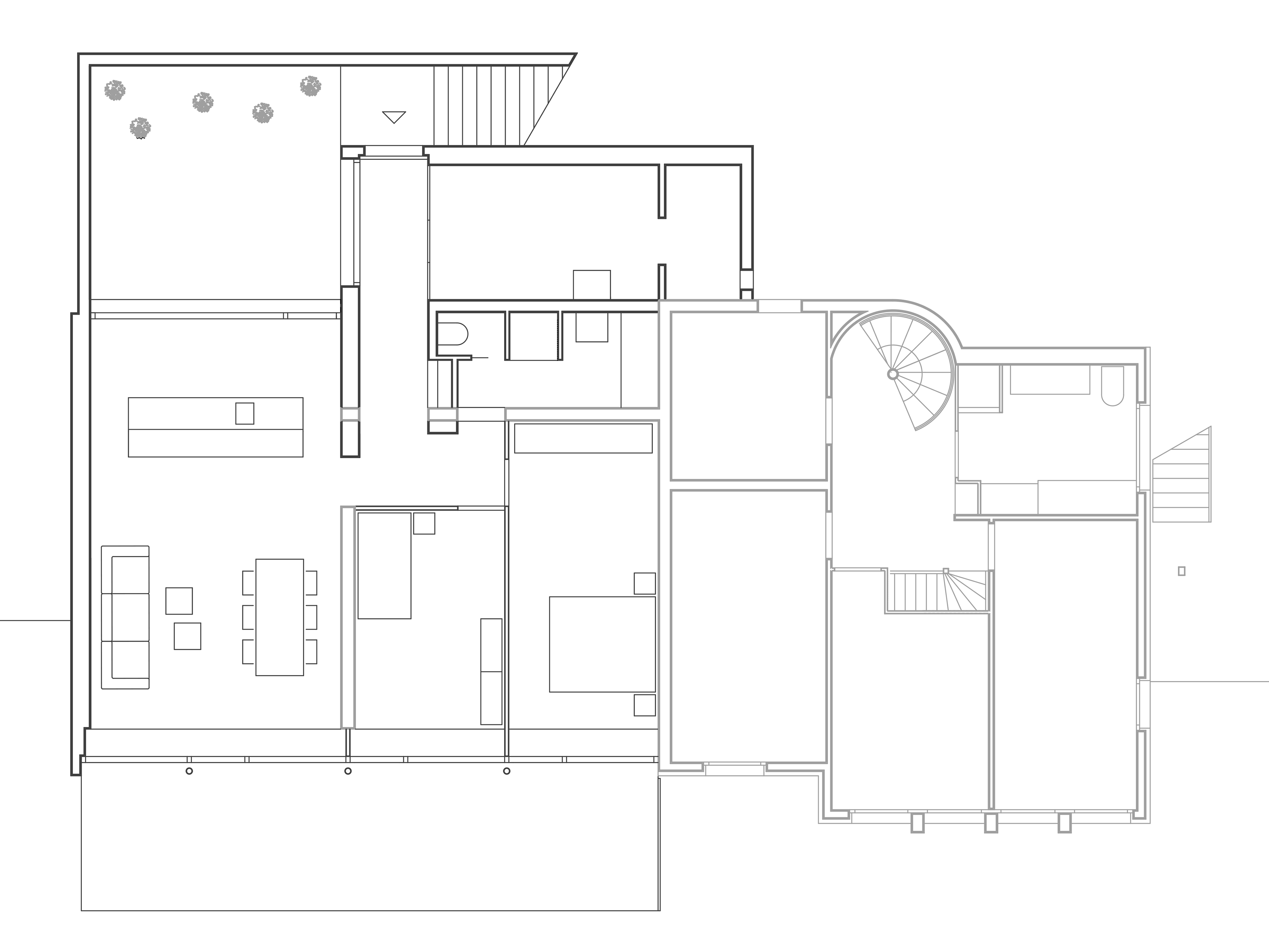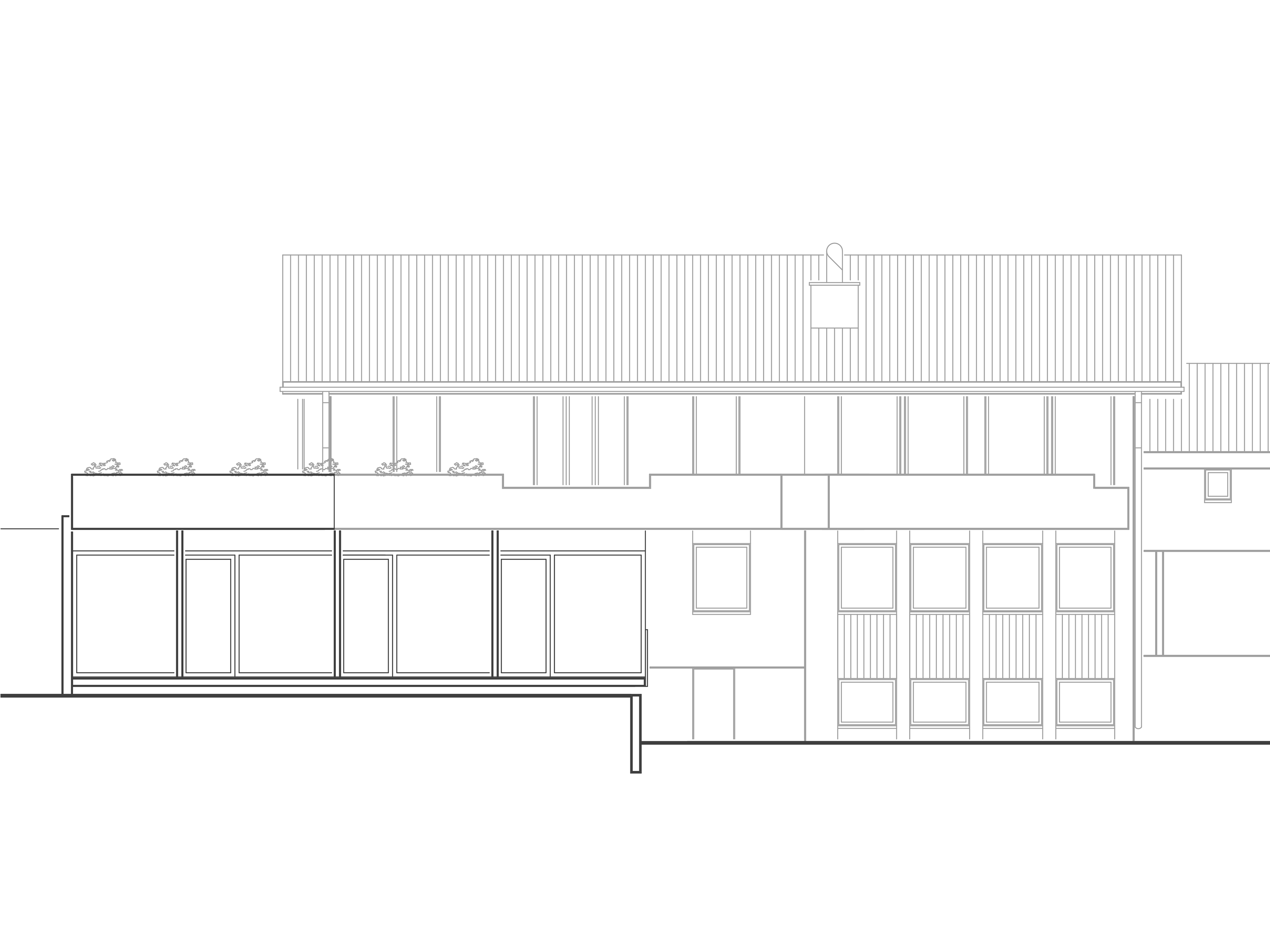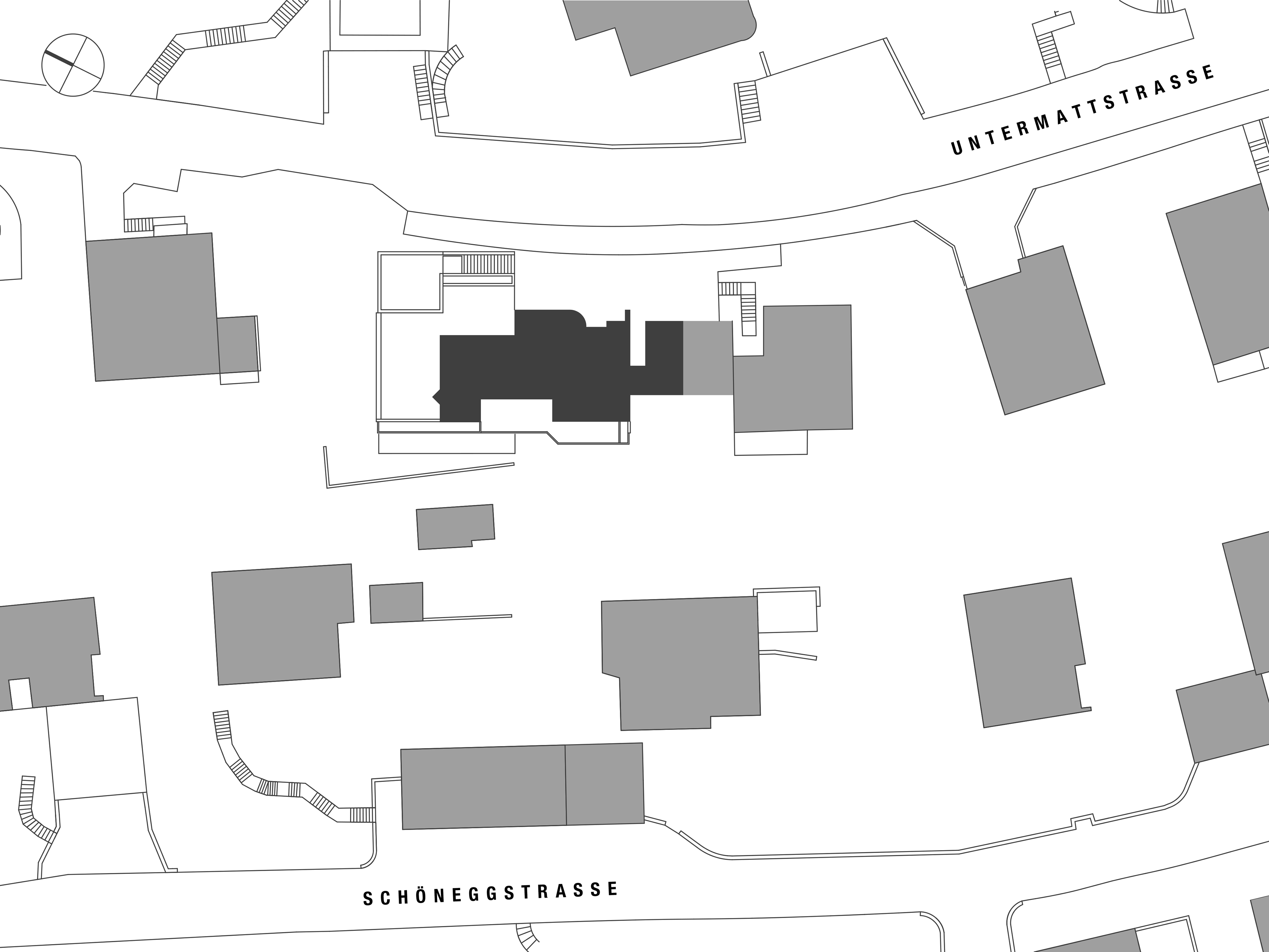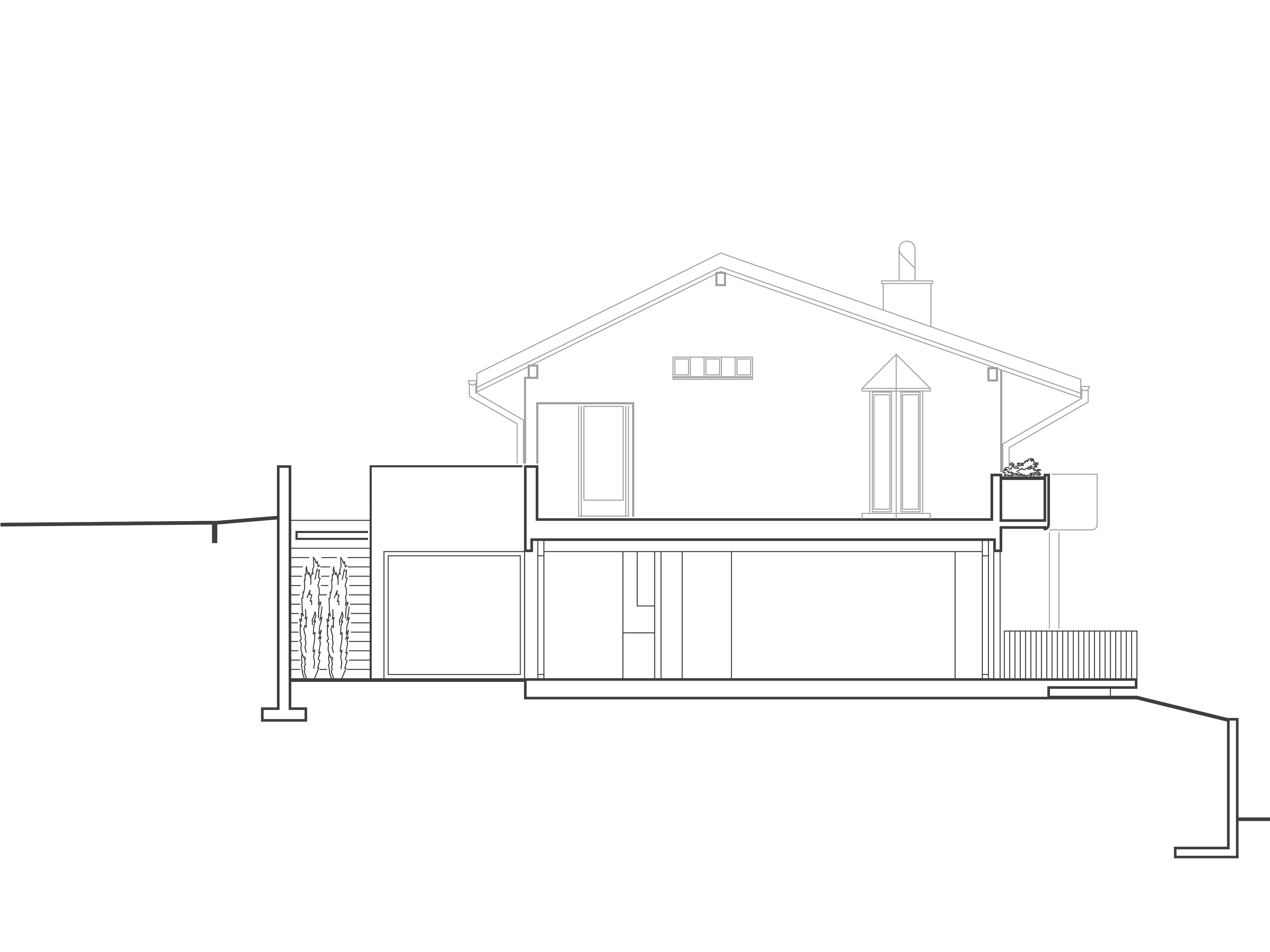 Das bestehende Einfamilienhaus ist von der Hangseite her erschlossen und tritt gegen die Strasse eingeschossig in Erscheinung. Auf dieser Ebene hätte die Einliegerwohung den grosszügigen Aussenraum des Einfamilienhauses verbaut. Sie wurde daher seitlich unter das Einfamilienhaus «geschoben». Dies machte die Wohnungserschliessung zur eigentlichen Herausforderung dieses Projekts.