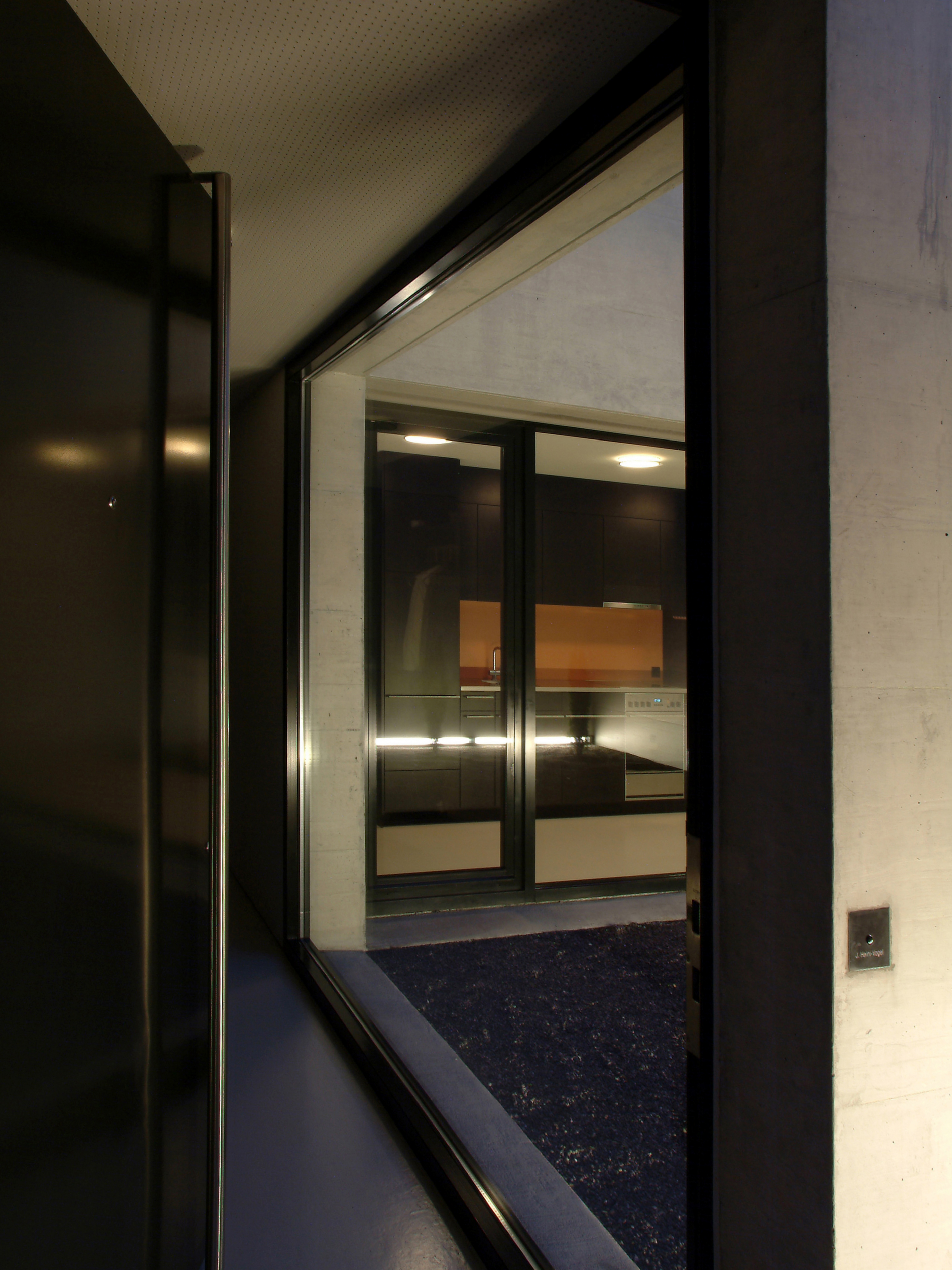 Mit einer breiten Aussentreppe und einem hangseitigem Atrium erhielt die Wohnung einen eigenen Zugang von der Strasse her. Die Wohnung öffnet sich auf der Hangseite mit raumhohen Fenstern aus der Küche und dem Korridor in das mit bläulich lasiertem Sichtbeton eingefasste Atrium. Es entsteht ein asketischer Raum, unterstützt durch seinen feinen, grauen Rundkies und in der Nacht mit einem Lichtband beleuchtet.