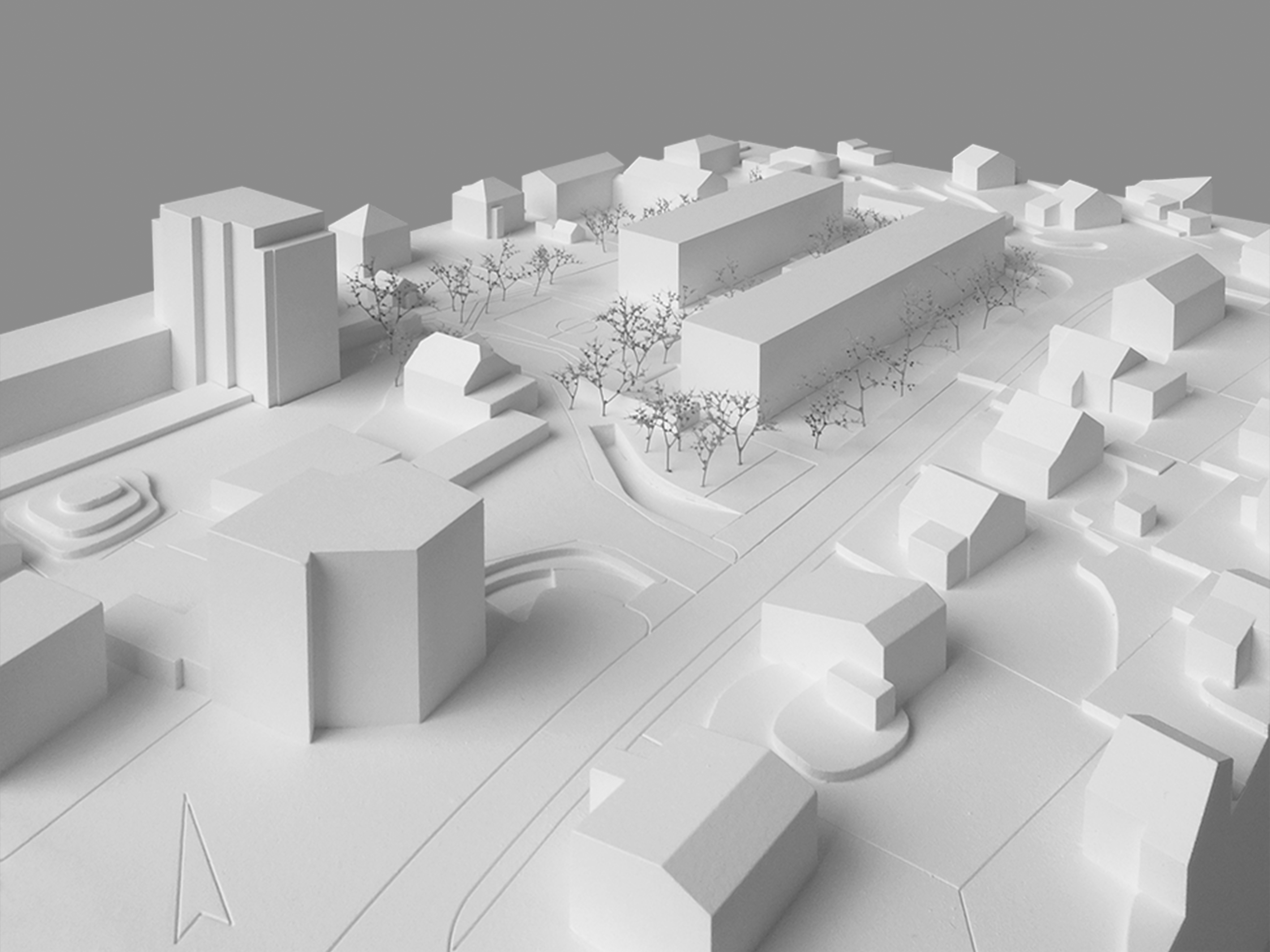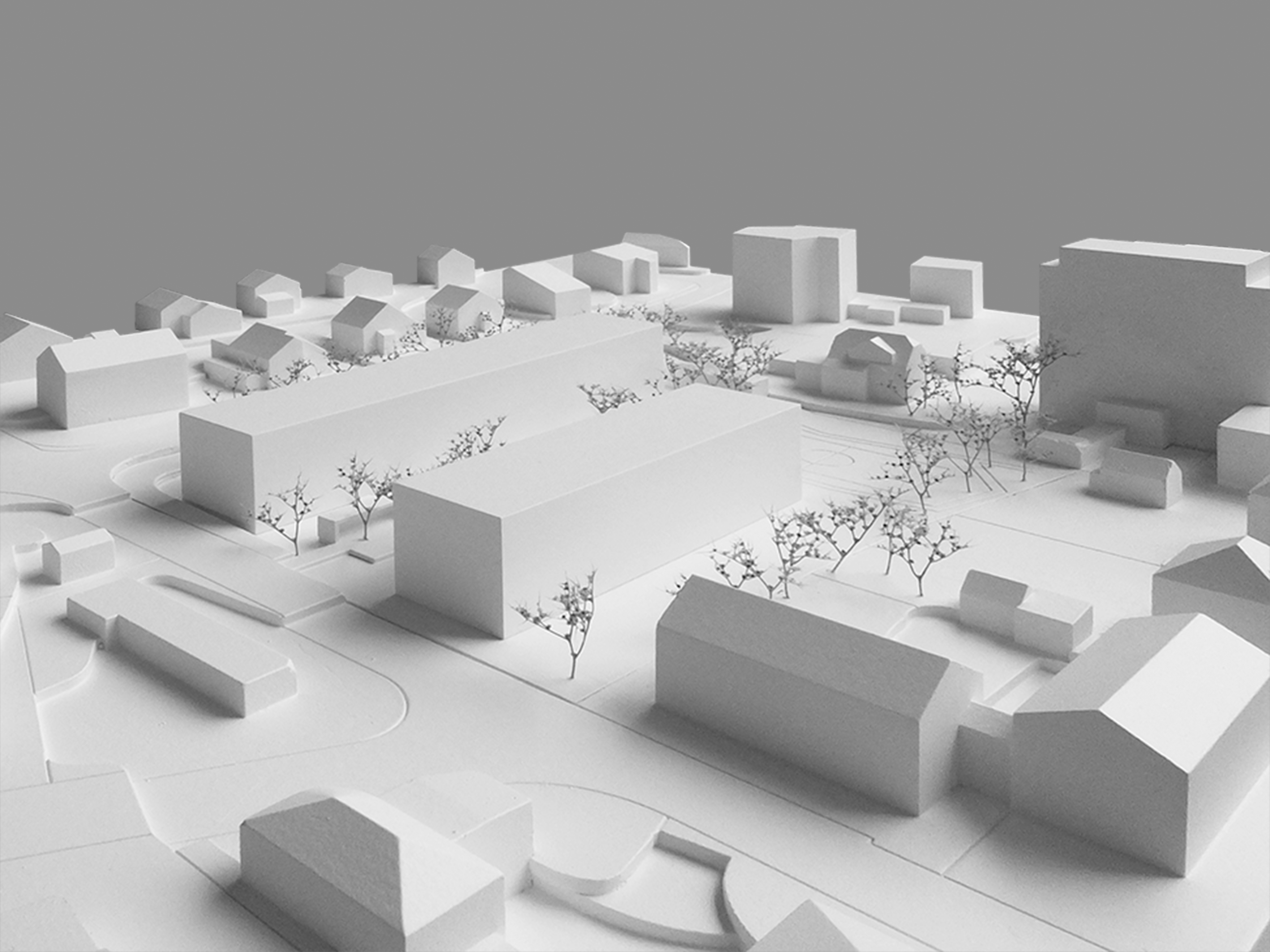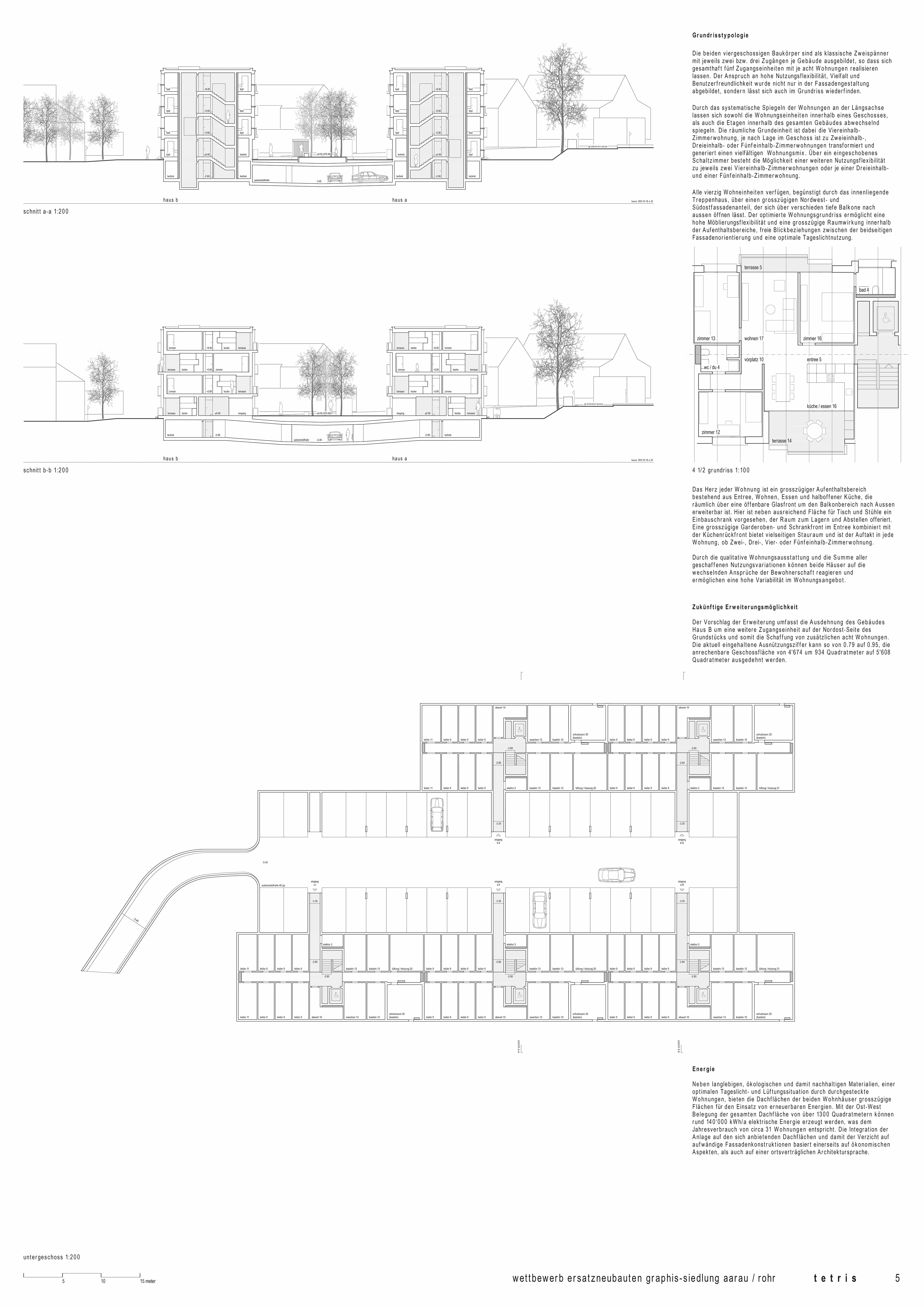 Das bestehende Quartier ist charakterisiert von zwei- bis dreigeschossigen Ein- und Mehrfamilienhäusern, sowie dem markanten Märklin Hochhaus und der angrenzenden städtischen Bebauung Aaraus. Der dabei entstehende Bebauungskontrast wird in der Entwurfsaufgabe aufgegriffen und formuliert die Ersatzneubauten der Graphis Bau- und Wohngenossenschaft als Bindeglied in der bestehenden Siedlungsstruktur zu einem ausgewogenen städtebaulichen Ganzen. Durch die Dimensionierung und Setzung entlang der Zonengrenze vermitteln die beiden länglichen Baukörper mit Südost-Nordwest Ausrichtung zwischen dem Massstabssprung der Siedlung und artikulieren deren Übergang. Ortsprägende Elemente, wie die umlaufende Hecke und erhaltenswerte Einzelbäume an der Grabenstrasse werden übernommen und als wesentlicher Teil in die Aussenraumgestaltung eingebunden.